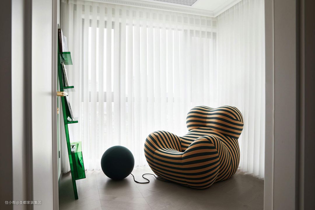 书房临窗而设,光线优越;亚克力书架极具设计感,青葱绿的颜色又活跃了空间氛围;妈妈的怀抱椅坐感舒适,简洁轻盈样式迸发出独特的时尚感与精致感。