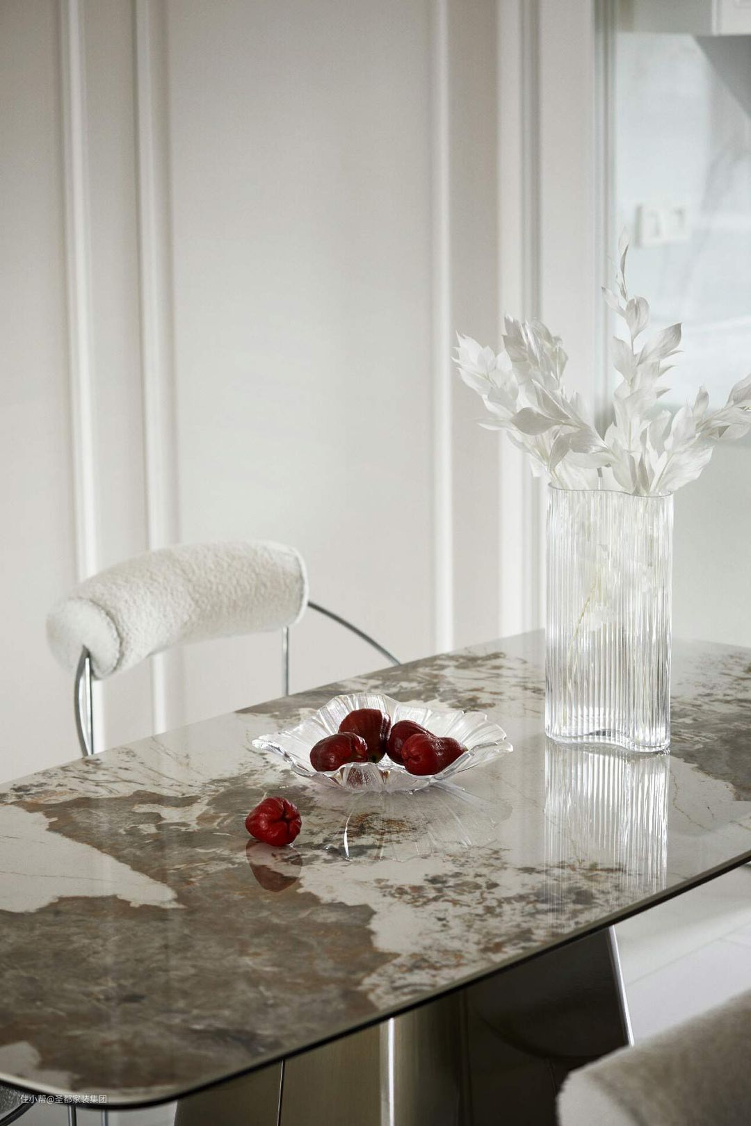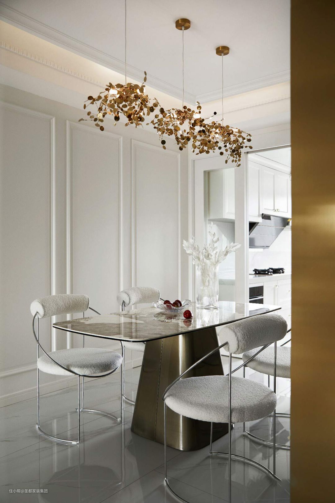 餐厅承接了整体典雅、矜贵的风格,呈现出一个童话般纯净的雪域王国。大理石餐桌自带贵气,上悬一簇金叶灯,加强了空间的轻奢属性;长虹玻璃花瓶空灵澄澈,放置几枝兰叶,流泻出翩然的仙气。 定制餐边柜以双面玻璃为底,空灵澄澈,又镶嵌了金属框架,强调了质感与时尚,不仅能起到储藏和装饰的作用,还是功能区的软隔断,颜值与功能并存。