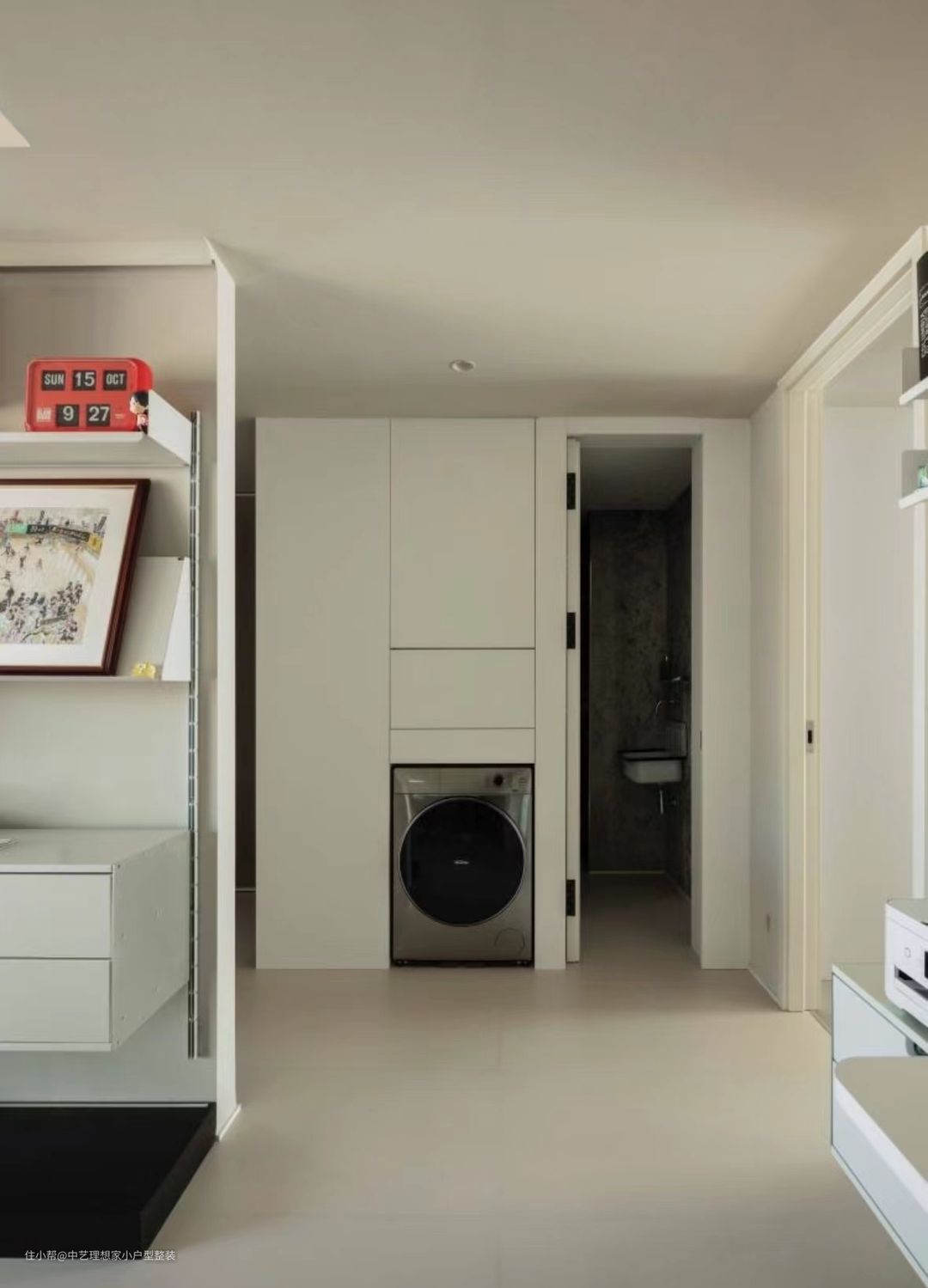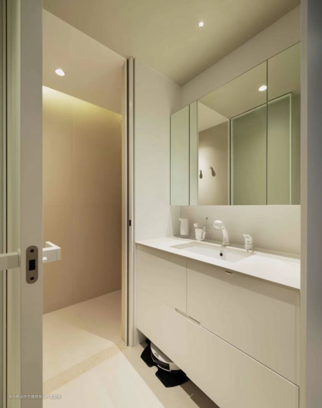 卫生间可以说是整个房间中变动最大的,也是花了最多心思来设计的。谁能想象不足70平方米的户型里,居然能实现卫生间三分离呢? ~ 干区是定制的纯实木浴室柜,岩板台面及陶瓷台下盆,浴室柜下方是科沃斯扫地机器人,因为干区处于开放空间,扫地机器人可实现无障碍工作,自动换水洗涤拖布头的污水可就近通过浴室柜排污管排出。内侧是淋浴间,考虑到安全性,将淋浴间门设为外开,如有意外发生,不会打不开门而耽误救援;淋浴间顶面靠墻一侧暗藏了洗墙灯以及出风口,满足照明与通风需求。 ~ 与浴室柜相邻的是洗衣区,嵌入式洗烘一体机,洗衣机上方一层设计有抽拉板,可在这上面叠好衣服直接拿回房间,上方储物柜内可收纳各米注涤用品,拿取超方便。 ~ 洗衣机右侧是马桶间的入口,靠墙一侧有一根贯穿全楼的中水管,因此我们采用方钢+木方做基层加固,再安装门套,实现稳固性和耐用性。 ~ 马桶间墙面采用局部贴砖+壁布的形式,马桶周围铺贴10CM*10CM的黑色手工小方砖,富有质感,其余墙面是与地砖同色系的花纹壁布,使空间不是单调,其中一角是Molly品牌的复古搪瓷洗手盆,墙出墙排,不占用寸土寸金的地面。