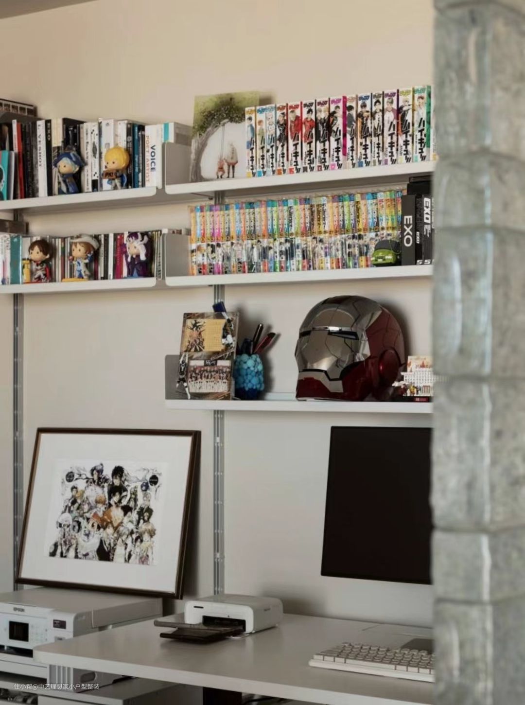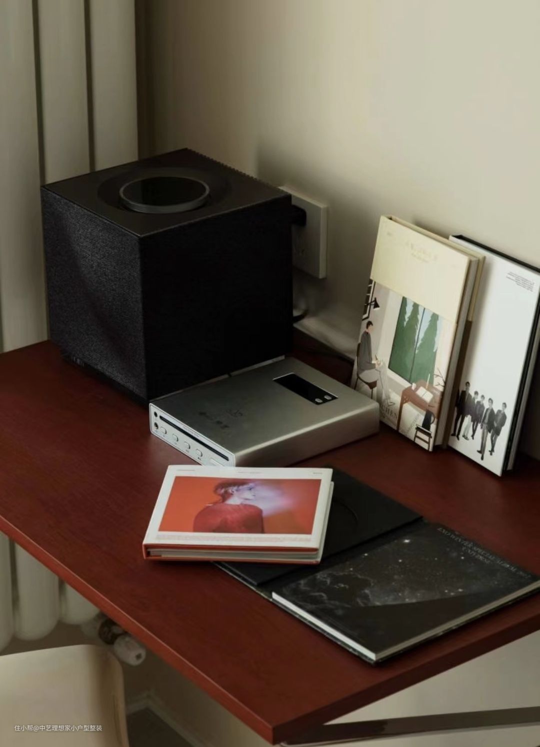 业主偶有居家办公需求,在客厅一角设置为小书房,同样使用挂架来摆放各类书籍;并定制木盒包住电动升降桌的桌腿,使其在空间内更协调。桌面插座也是我们设计中的小心思:桌面左上方盖板打开后是插座和网线接口,其固定在桌面下方的暗盒中,电源线和网线通过蛇皮管跟随桌面升降,无需担心线路出现金属疲劳而折断。