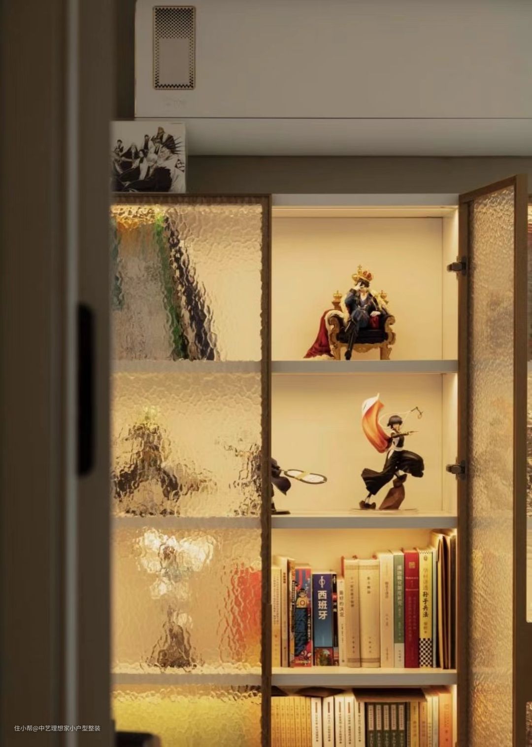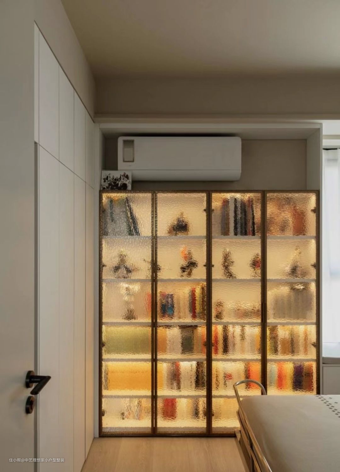 相比主卧而言,次卧的趣味性更多,比如有着优美圆弧曲线的铁艺床,再比如独具特色的玻璃书柜。而收纳方面也做足了文章,所见之处,皆为收纳:门后是整面墙的衣柜,窗下也是与窗台等高的地柜,既能储物,又是飘窗,从这里看向室外,北侧和东侧风景尽收眼底,视野极其开阔。 ~ 极窄金属边框镶嵌水晶质感的冰纹玻璃,每层隔板都嵌入灯带,打开灯光,朦胧感由内而发,极具视觉冲击力。