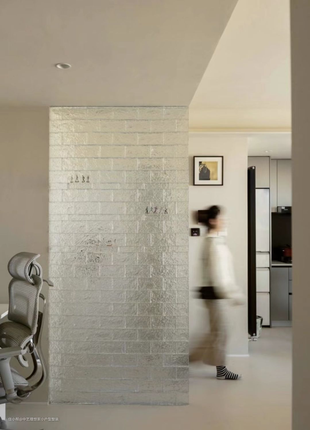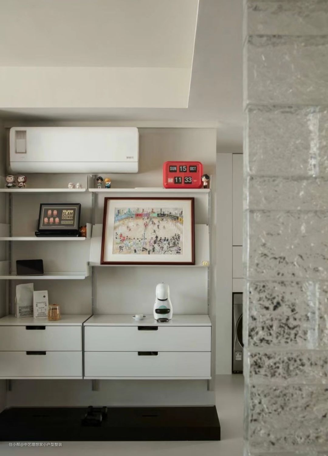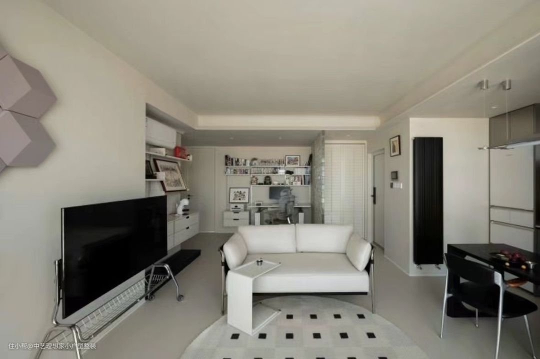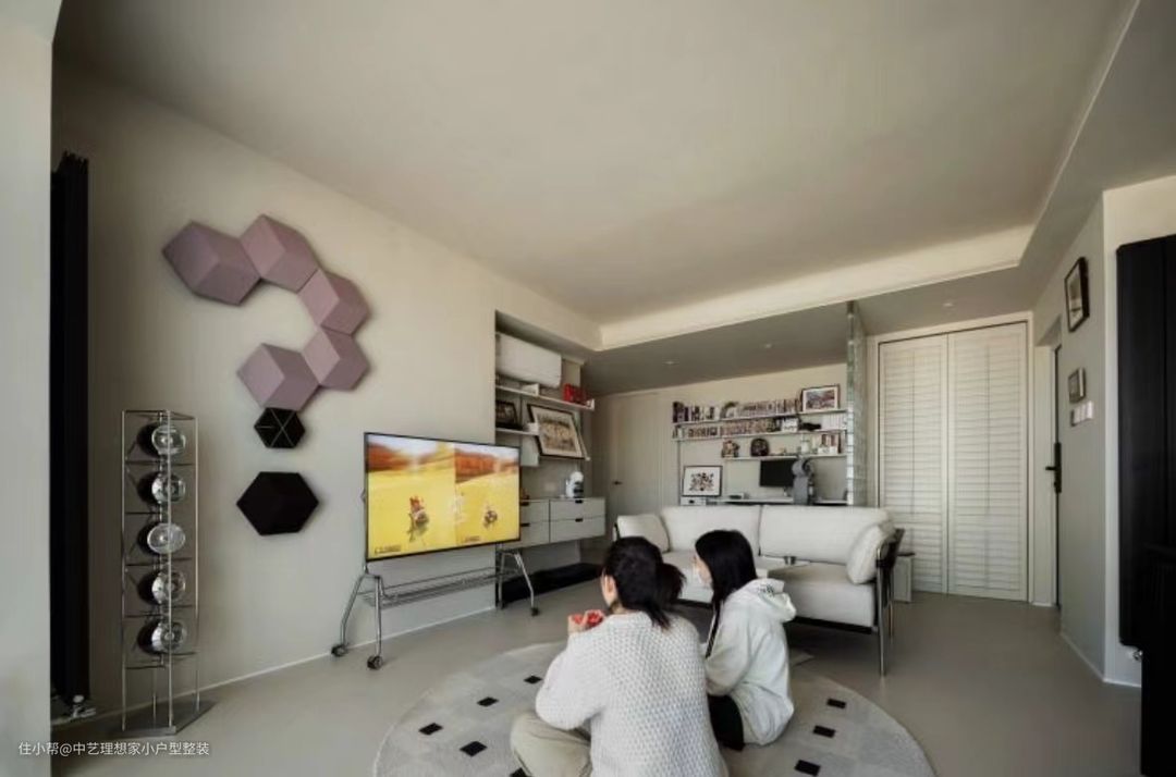 这是一个集中了美学主义与实用主义的玄关:迎面而来的是一整面的玻璃砖墙,如水晶般晶莹剔透,夜间打开灯光,预埋在玻璃砖顶部与底部的灯带使玻璃砖呈现出点点光斑,更佳璀璨夺目。 ~ 从实用主义出发,我们在这里隔出1.5平方米的小小储物间,通过宜家挂墙置物架实现鞋子等杂物收纳,同时我们还将入户网线和MESH主路由器放到这里,以实现全屋网关的智慧互联。外侧是纯实木格栅折叠门,可根据需要,自行调节门板格栅的开闭形式,无需敞门即可实现通风换气,极大提升了舒适感。 ~ 整个客厅空间从顶到墙到地面,以纯净的米白色呈现,整个空间面积虽然不大,但丝毫不觉得狭仄。摈弃传统的电视柜+茶几+沙发的布局形式,改移动式电视+双人沙发,围合感更好,同时在空间上也能够与餐厅衔接,增强互动性。 ~ 墙面上安装了蓝牙音箱,并通过不同颜色不同大小的发音模块拼成“?”图案。周末闲暇时光,约上三五好友,盘坐于此沉浸在电子竞技的无限欢乐之中。 ~ 由于空间有限,我们拆除与次卧隔墙的非承重部分,向次卧一侧缩进,为客厅抢出约50CM 宽的空间,各类装饰品都可摆放于此,还可兼做一个小小的咖啡吧;地面是8CM高的实木地台,打开上面的翻板是专为电视预留的电源和网线插座,使用时,打开翻板,即可轻轻松松取电,用罢,盖上盖板,整洁有序,丝毫不会凌乱不堪。顶部的空调管从左侧经次卧衣柜顶部到达室外机,所有的管线均在设计之初就充分考虑到走向及隐蔽方式,以求最终的完美效果。