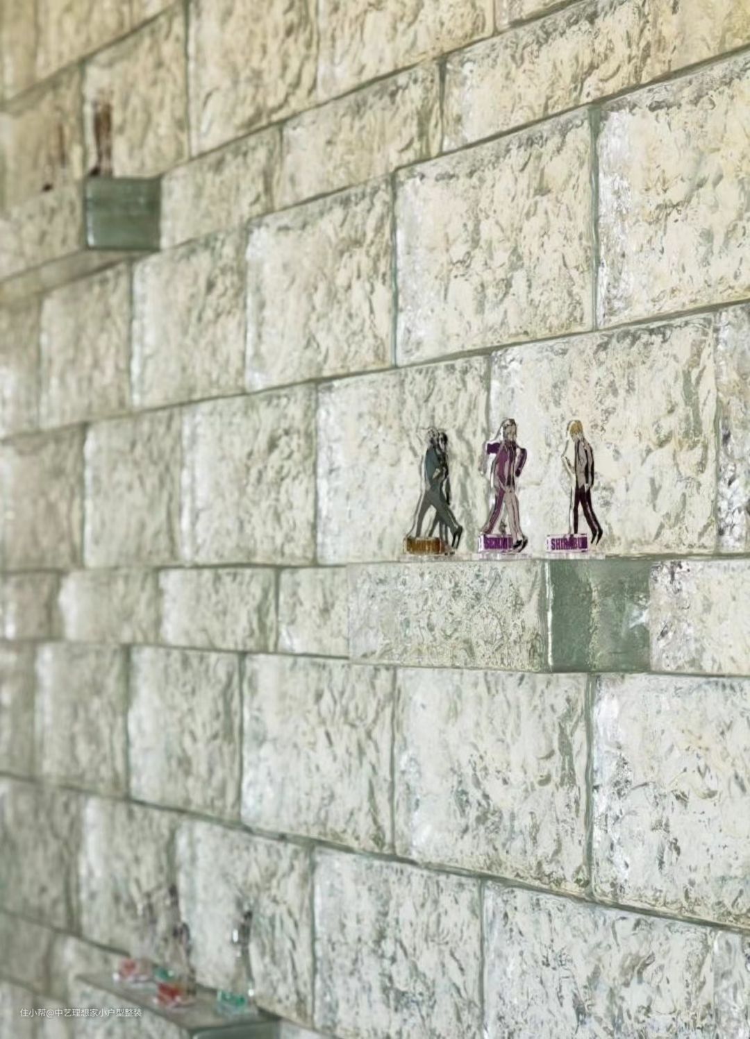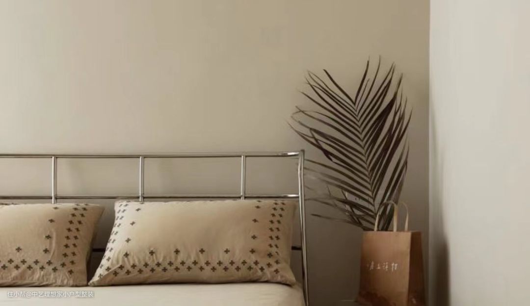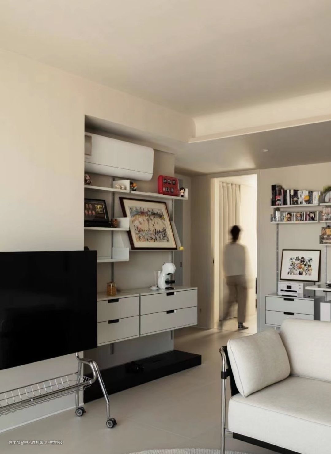 这是一个集中了美学主义与实用主义的玄关:迎面而来的是一整面的玻璃砖墙,如水晶般晶莹剔透,夜间打开灯光,预埋在玻璃砖顶部与底部的灯带使玻璃砖呈现出点点光斑,更佳璀璨夺目。 ~ 从实用主义出发,我们在这里隔出1.5平方米的小小储物间,通过宜家挂墙置物架实现鞋子等杂物收纳,同时我们还将入户网线和MESH主路由器放到这里,以实现全屋网关的智慧互联。外侧是纯实木格栅折叠门,可根据需要,自行调节门板格栅的开闭形式,无需敞门即可实现通风换气,极大提升了舒适感。 ~ 整个客厅空间从顶到墙到地面,以纯净的米白色呈现,整个空间面积虽然不大,但丝毫不觉得狭仄。摈弃传统的电视柜+茶几+沙发的布局形式,改移动式电视+双人沙发,围合感更好,同时在空间上也能够与餐厅衔接,增强互动性。 ~ 墙面上安装了蓝牙音箱,并通过不同颜色不同大小的发音模块拼成“?”图案。周末闲暇时光,约上三五好友,盘坐于此沉浸在电子竞技的无限欢乐之中。 ~ 由于空间有限,我们拆除与次卧隔墙的非承重部分,向次卧一侧缩进,为客厅抢出约50CM 宽的空间,各类装饰品都可摆放于此,还可兼做一个小小的咖啡吧;地面是8CM高的实木地台,打开上面的翻板是专为电视预留的电源和网线插座,使用时,打开翻板,即可轻轻松松取电,用罢,盖上盖板,整洁有序,丝毫不会凌乱不堪。顶部的空调管从左侧经次卧衣柜顶部到达室外机,所有的管线均在设计之初就充分考虑到走向及隐蔽方式,以求最终的完美效果。