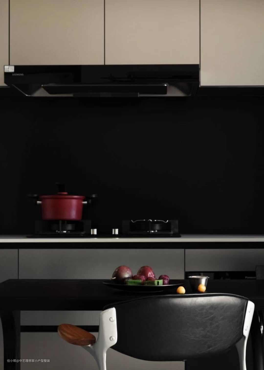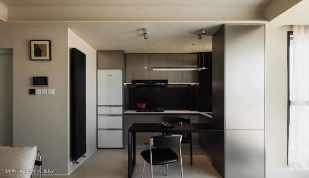 原始户型的厨房是一个封闭空间,且与客餐厅动线较远,重构格局后,拆除厨房与客厅的隔墙,改为开放式厨房,L形橱柜布局,洗切炒流畅动线,台面与墙面是轻量化的岩板,纹样美观大方,且比传统石英石更精致更美观,加上类似金属质感的柜门,厨房实现了多层次的丰富质感。 在餐桌右侧高柜内,是厨房的排水管道以及燃气热水器,将其收纳在柜内,既方便检修,又实现了机电设备的无暇隐蔽,从外面看,超整洁! ~ 一张1.6米的大餐桌置于厨房与客厅之间,既可作为餐桌,又可作为岛台,无论是烹饪时还是用餐时,既能感受到生活的烟火气,也能够感受与家人沟通的亲和感,相比封闭式厨房仅一人默默下厨,更具有幸福感。