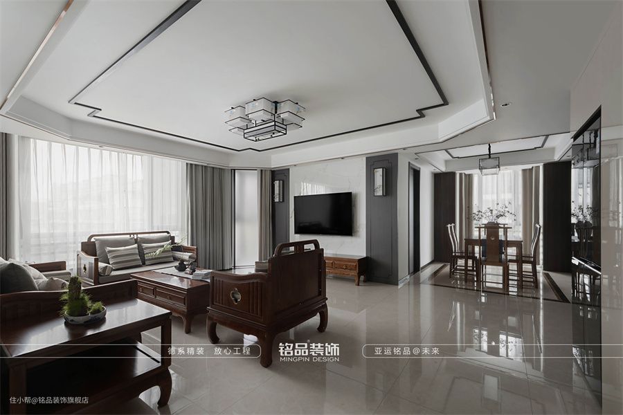 在设计候我结合了户型的特点和业主喜欢的新中式风格,在顶面设计的时候顺势设计了一个"八"字造型的吊顶,配上胡桃色实木线条。整屋在色彩上用红系中朱砂红来强调中式气韵,电视背景墙由沉稳的黑色和干净的水墨纹瓷砖,佐以陶瓷元素等,现代式设计融合了传统中式元素,相得益彰。 沙发后边靠近窗户的位置设计了一块护墙和壁灯,让电视背景和沙发在一条中轴线上,同时也呼应了吊顶的走线。点睛之笔:顶上的八角造型和原始户型非常吻合,把户型原本的劣势转化成优势,形成灵动新趋势。#沙发背景墙 #沙发 #吊顶#客厅 #吊顶 #新中式