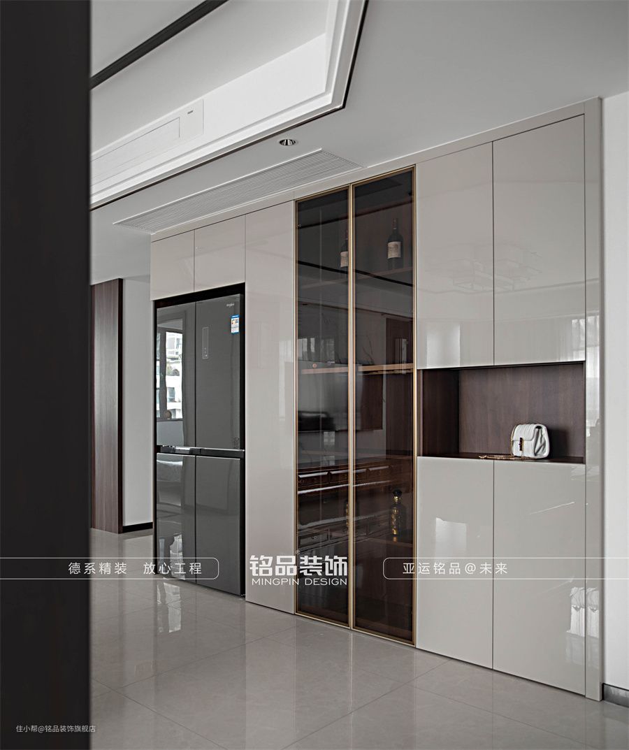 由于厨房面积有限,为了最大程度利用可用空间,我们把冰箱挪出厨房,做了内嵌式的处理,在餐厅侧设计了整面墙的柜子,门侧柜体中部留出30*90cm,进深40cm的位置做了开敞格,可以放一些小家电。#餐边柜 #冰箱 #餐厅