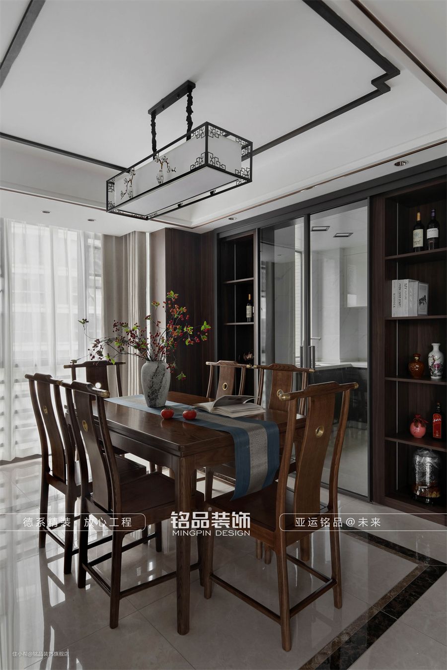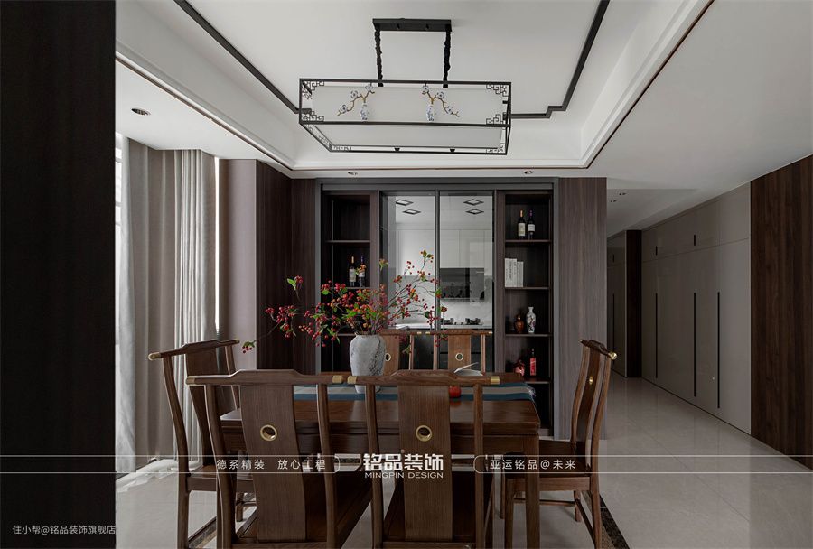 餐厅设计完全符合了东方美学的概念。呼应整屋的胡桃木餐桌椅、整面墙的木饰面充满韵味。餐厅主灯以陶瓷元素延展开来,古色古香。 中式韵味通过空间的陈设、雕镂中的古典纹样营造出更显华丽、优雅、更具韵味的空间视觉张力。取其意、演其境、用其韵,不分繁冗与岑寂,中式之美便是东方生活的姿态。#餐厅 #餐桌 #餐椅#餐厅 #餐桌 #吊灯