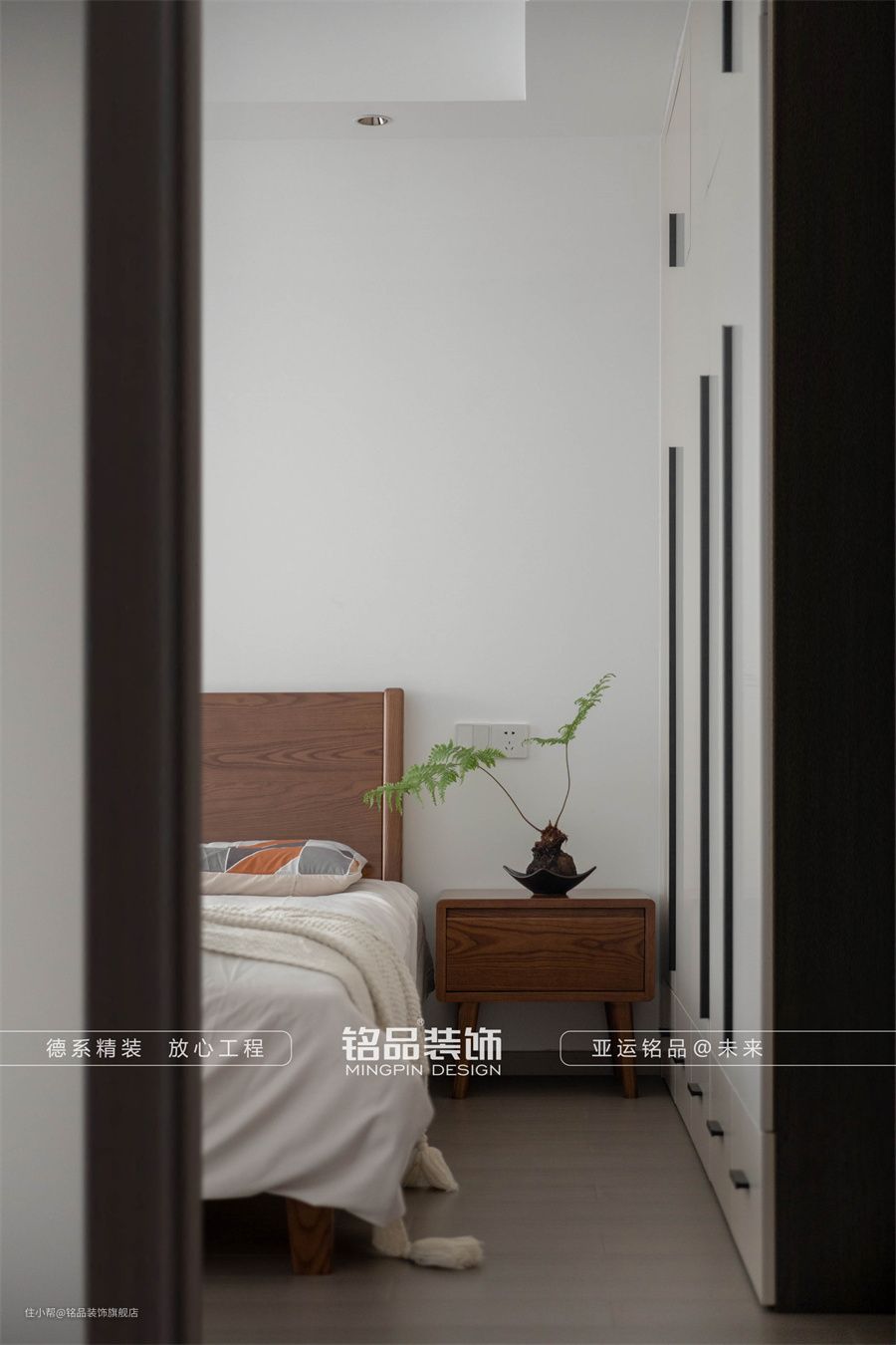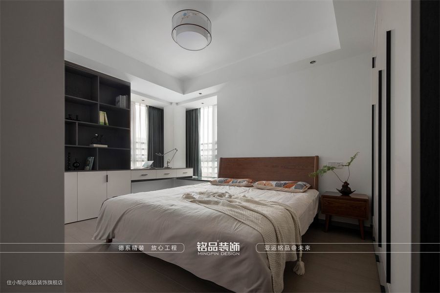 主卧以大白墙为主基调,搭配深木色的床及地板,床品选择比较丰富的花色,让空间看起来没有那么单调。床头和床尾的盆栽还有吊灯都选择了中式元素的。#卧室 #床 #吊灯 化简为繁。次卧没有用过多的色系点缀,我们把纯白定位卧室的主基调,干净清爽。同时木质地板中和了空间的清冷感,木质温润入心。床尾飘窗设计了一个简单清爽的工作台面,这样即使应对突发的工作需求也可以“足不出户”。#卧室 #书桌 #收纳