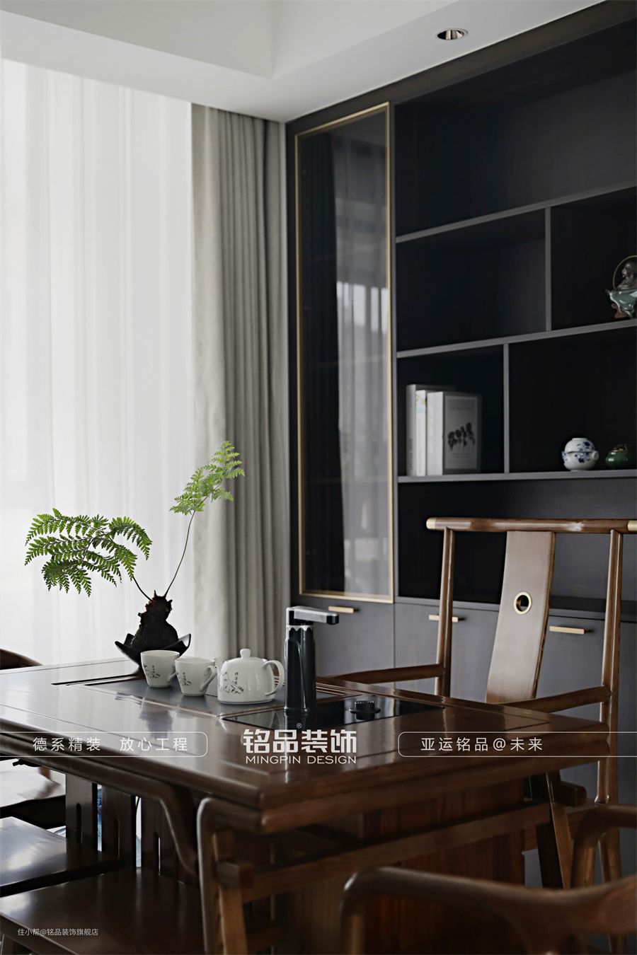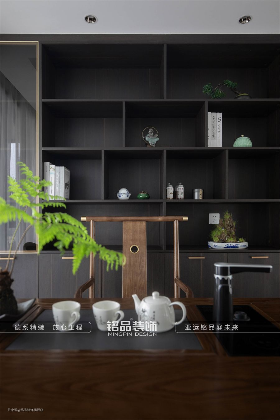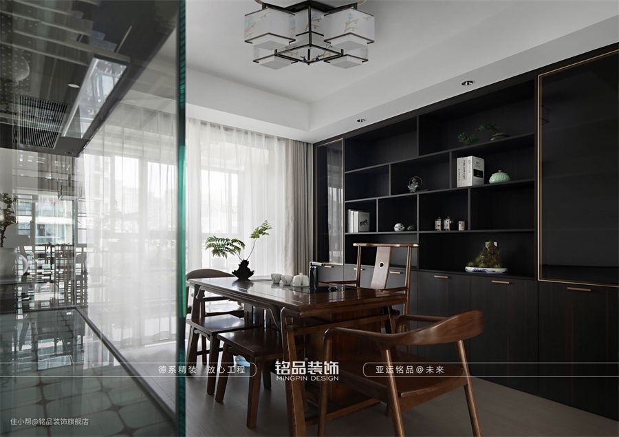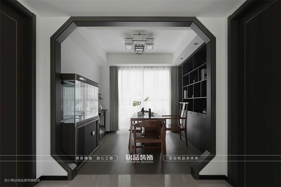 这是一套房龄约18年的户型,和现在新小区相比,户型的原始结构并非那么理想。特别是客厅西边阳台出去的门洞位置,使得方正的客厅少了一个角,而且电视背景和沙发背景也不对中。在设计的时候我结合了这种户型的特点和业主喜欢的新中式风格,在顶面设计的时候顺势设计了一个"八"字造型的吊顶,配上胡桃色实木线条。沙发后边靠近窗户的位置设计了一块护墙和壁灯,让电视背景和沙发对中。顶上的八角造型和原始户型非常吻合,把户型原本的劣势转化成优势。接着我把书房设计成开放式的,做了一个八角实木门套,和顶上的八角造型相呼应,书房的空间既和大厅相连,又有自己独立的区域。