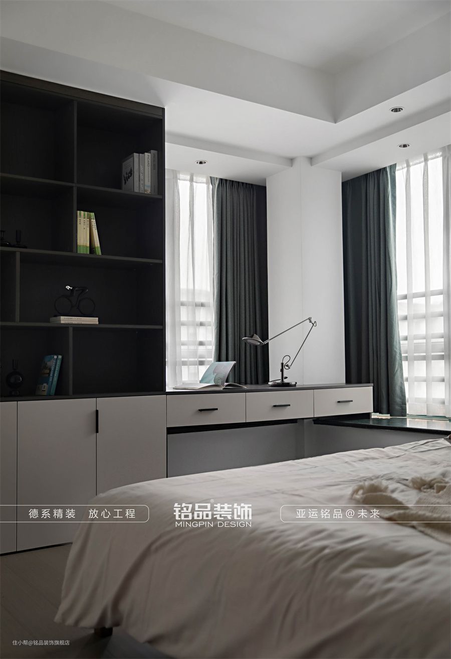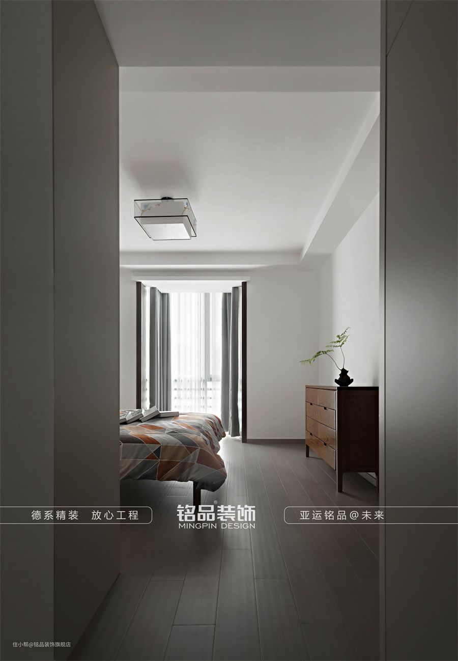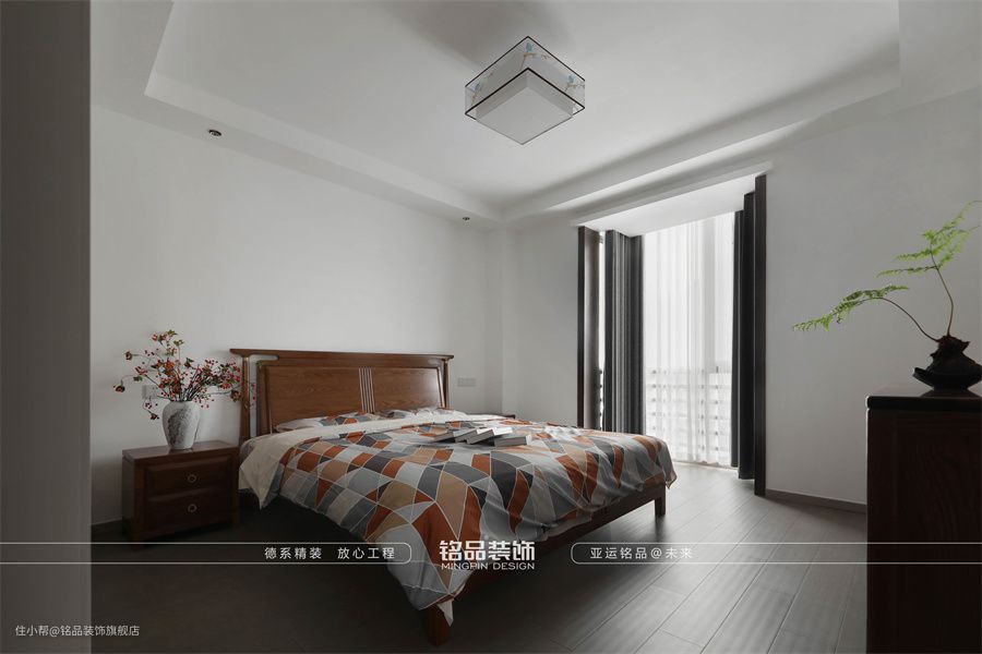 主卧以大白墙为主基调,搭配深木色的床及地板,床品选择比较丰富的花色,让空间看起来没有那么单调。床头和床尾的盆栽还有吊灯都选择了中式元素的。#卧室 #床 #吊灯 化简为繁。次卧没有用过多的色系点缀,我们把纯白定位卧室的主基调,干净清爽。同时木质地板中和了空间的清冷感,木质温润入心。床尾飘窗设计了一个简单清爽的工作台面,这样即使应对突发的工作需求也可以“足不出户”。#卧室 #书桌 #收纳