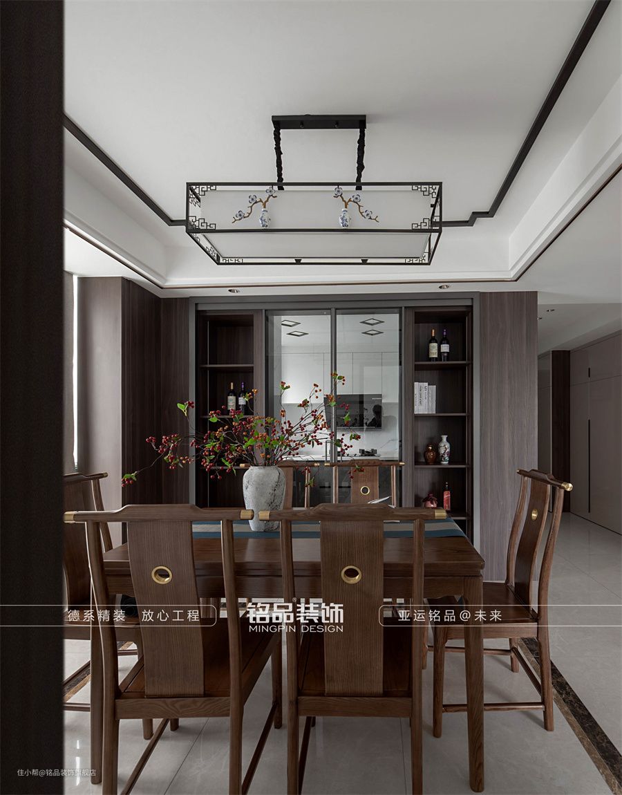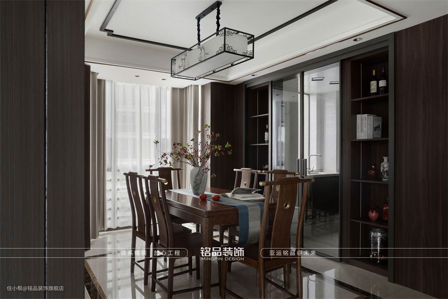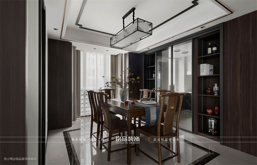 餐厅设计完全符合了东方美学的概念。呼应整屋的胡桃木餐桌椅、整面墙的木饰面充满韵味。餐厅主灯以陶瓷元素延展开来,古色古香。 中式韵味通过空间的陈设、雕镂中的古典纹样营造出更显华丽、优雅、更具韵味的空间视觉张力。取其意、演其境、用其韵,不分繁冗与岑寂,中式之美便是东方生活的姿态。#餐厅 #餐桌 #餐椅#餐厅 #餐桌 #吊灯