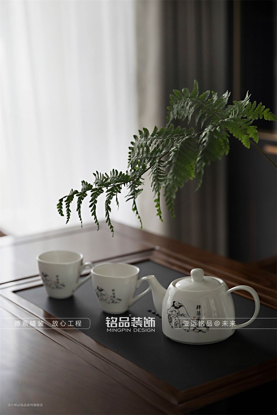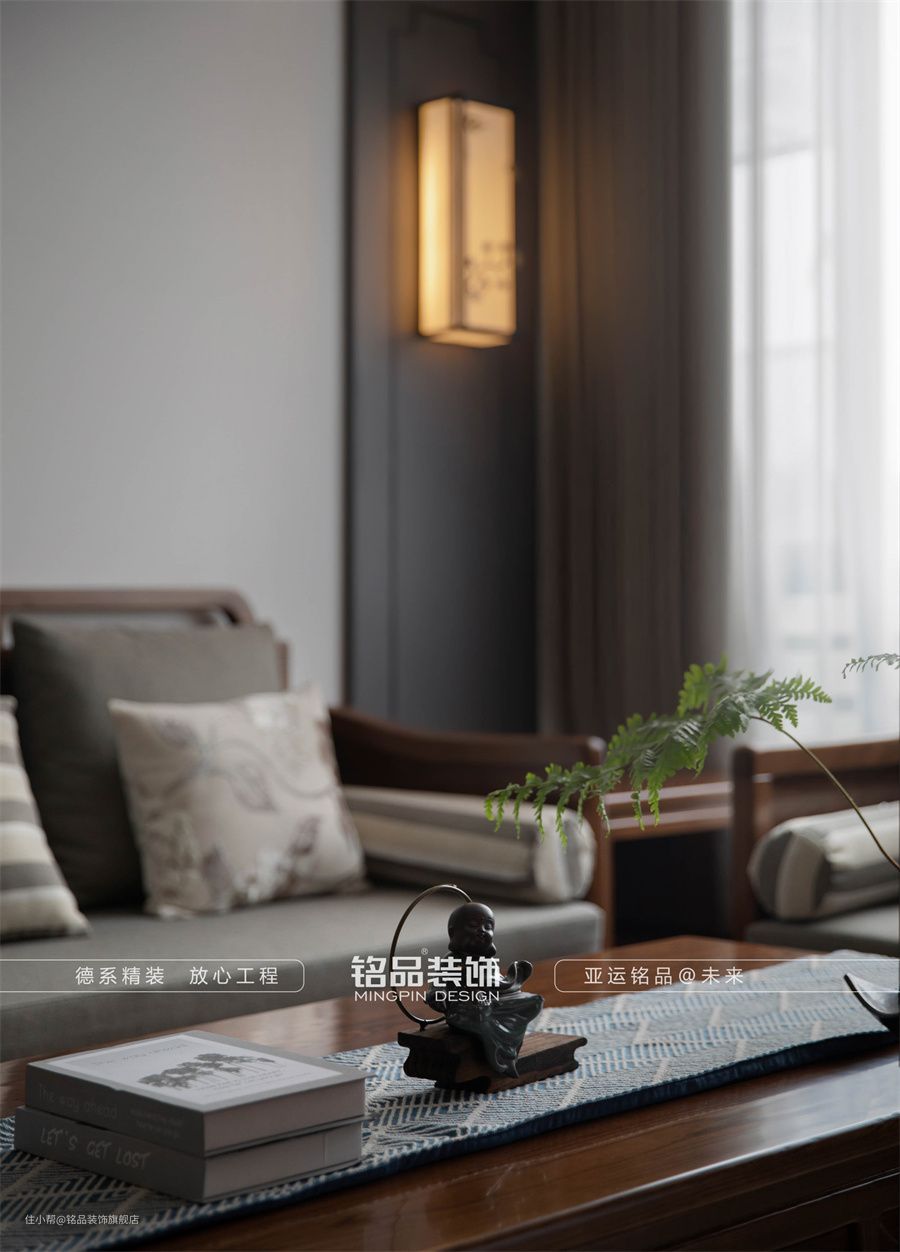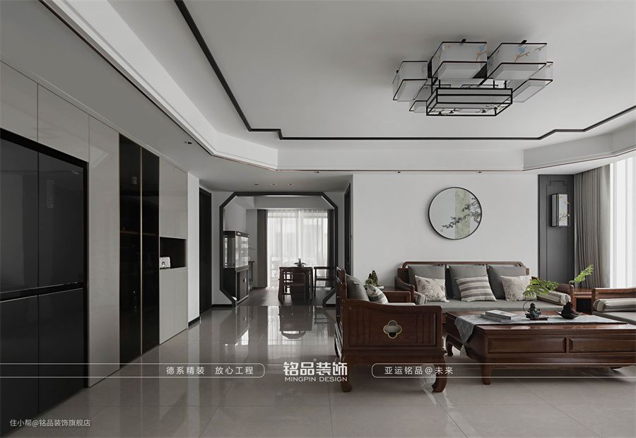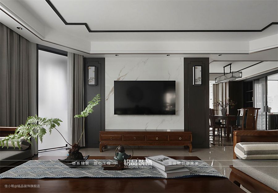 在设计候我结合了户型的特点和业主喜欢的新中式风格,在顶面设计的时候顺势设计了一个"八"字造型的吊顶,配上胡桃色实木线条。整屋在色彩上用红系中朱砂红来强调中式气韵,电视背景墙由沉稳的黑色和干净的水墨纹瓷砖,佐以陶瓷元素等,现代式设计融合了传统中式元素,相得益彰。 沙发后边靠近窗户的位置设计了一块护墙和壁灯,让电视背景和沙发在一条中轴线上,同时也呼应了吊顶的走线。点睛之笔:顶上的八角造型和原始户型非常吻合,把户型原本的劣势转化成优势,形成灵动新趋势。#沙发背景墙 #沙发 #吊顶#客厅 #吊顶 #新中式