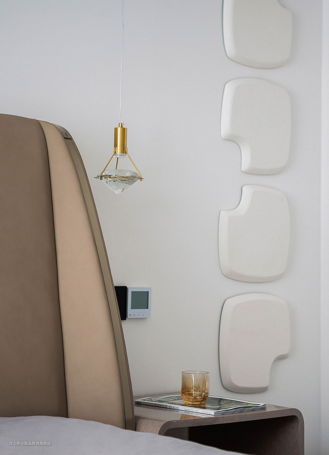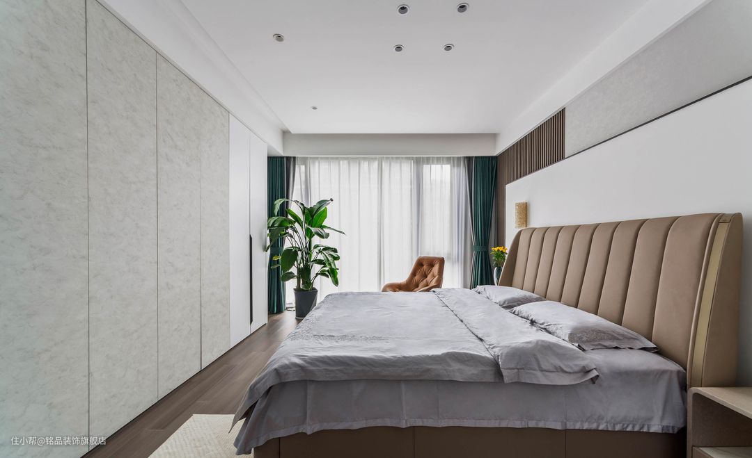 主卧硬装上还是以白色调为主,背景墙做了木格栅+花灰色硬包墙,在床和背景墙的之间还加了L型的护墙板,可以有效保护家具和墙面的摩擦感,白色的护墙板让室内光线都变得明亮了许多。 床选择了一个棕色系的皮质床,高床背+直线条,带来身体上的舒适和视觉上的享受。床侧的空地放了把单人椅,方便日常有一个坐的地方。#单人椅 #床 #床头背景墙#卧室 #背景墙 #床