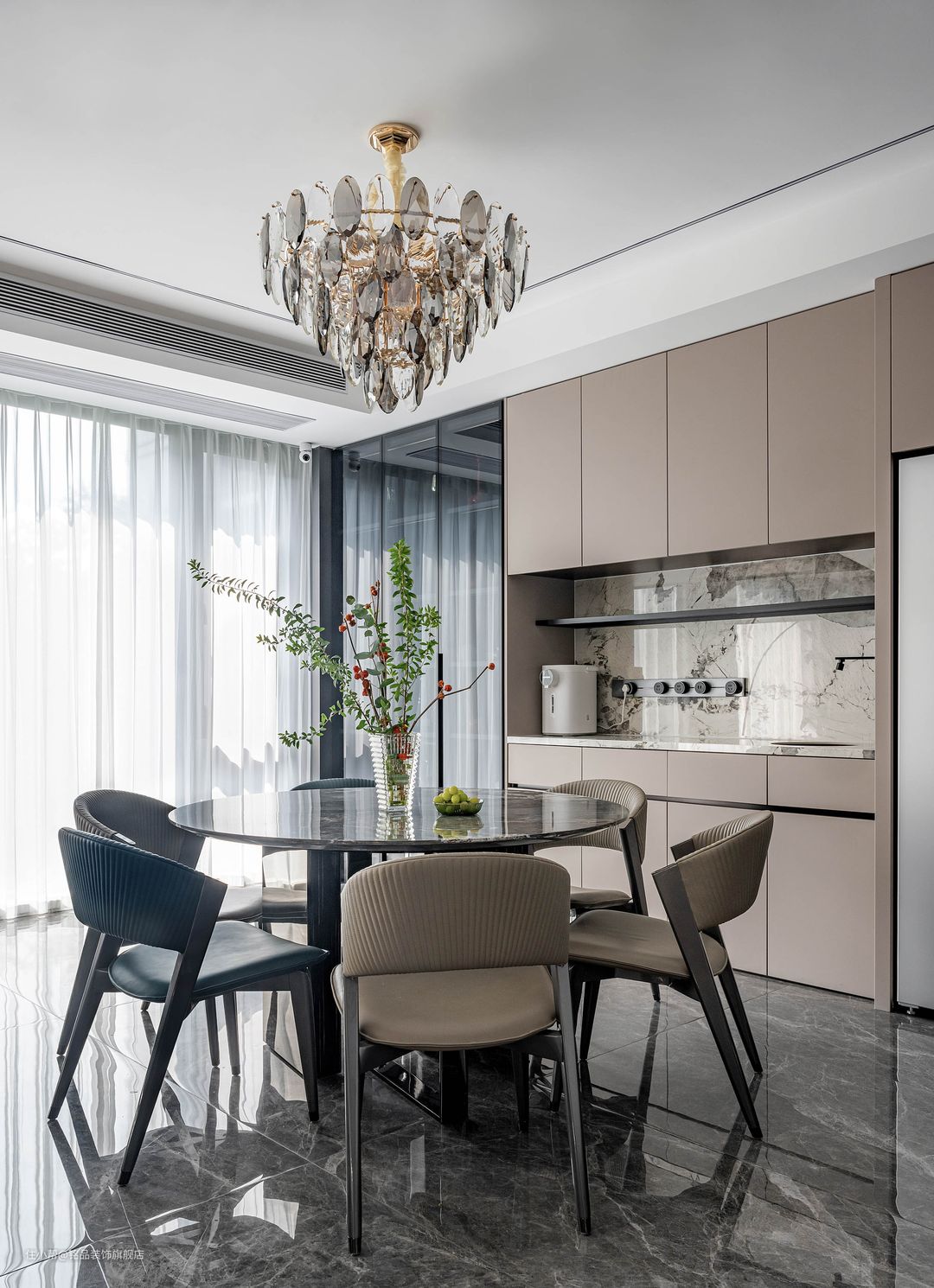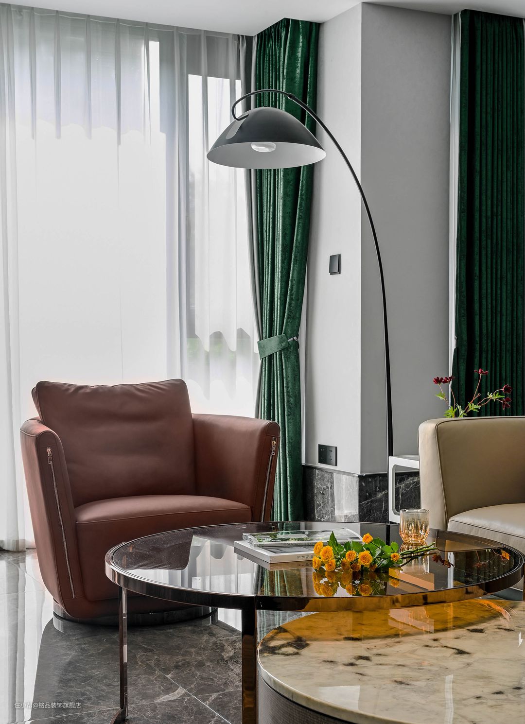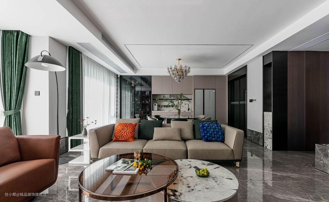 本期案例是跃层户型,空间配置四房两厅,面积180平,一楼主要做活动空间使用,配备客餐厅、厨房和客卧、客卫。二楼主要做休息空间。客餐厅是大横厅的布局,空间的采光和视野都比较好。空间多运用大理石、木饰面,皮革等现代的元素,营造现代风的高级气质,再通过一些摆件带来轻奢感。