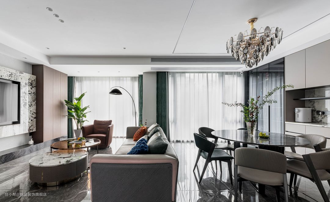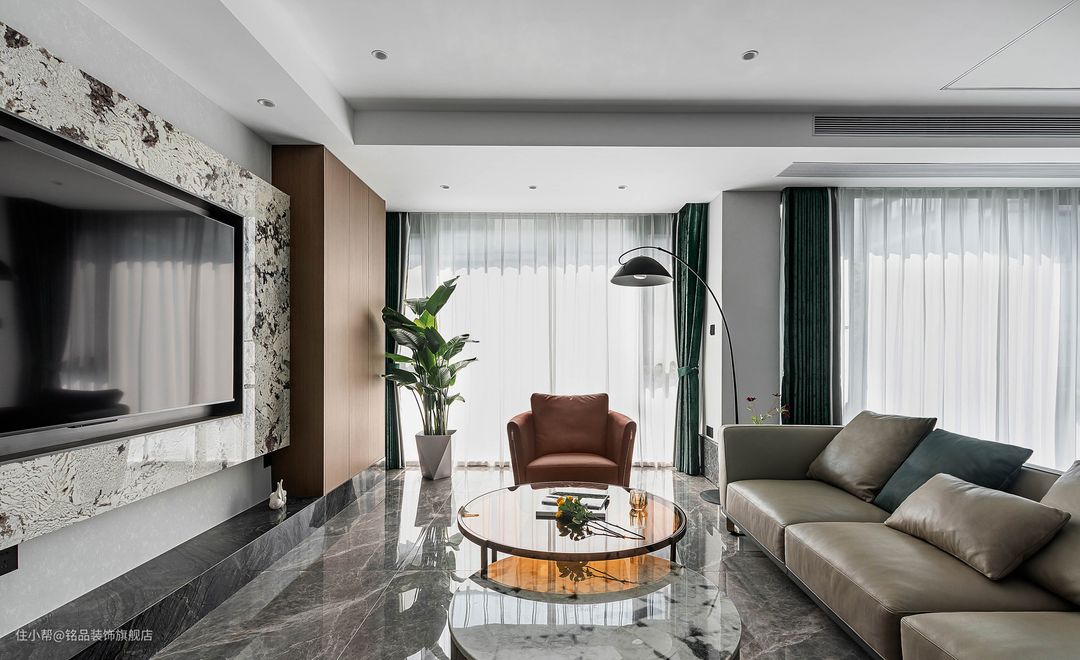 公区有大面落地窗的加持,采光面、通风、视野都有一定程度的扩大,再搭配无主灯+无吊顶设计,整个空间特别宽敞。 横厅布局将客餐厅合并,沙发不靠墙作为软隔断,让客厅形成洄游动线,有效增加空间的利用率,提升空间的格调感。 电视背景墙局部铺贴花色大理石,用来丰富墙面的层次感,黑色大理石地台落地,做电视柜使用。电视区的两侧墙面分别做了木饰面隐形柜,来提升公区的储物空间。 沙发选了灰撞橘色的皮质沙发,整齐造型很简约,真皮材质的质感和舒适度都很棒。茶几选了亚克力搭配大理石的双茶几,材质的混搭让空间质感更为丰富。#电视背景墙 #沙发 #客厅#客厅 #横厅 #沙发