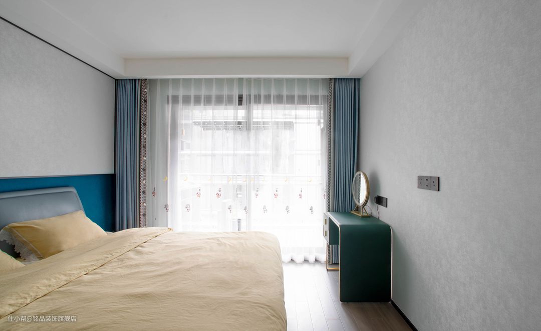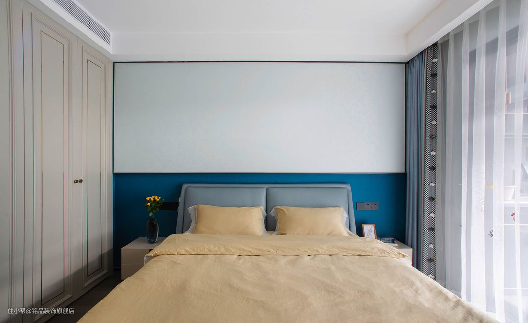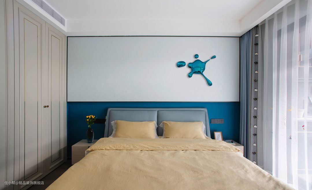 儿童房的背景墙做了上下拼色设计,浅蓝+深蓝的配色,很清爽,也适合男生。床侧定制了整墙衣柜,满足日常储物需求,床尾放了张学习桌,方便孩子学习做作业。#儿童房 #背景墙 #衣柜