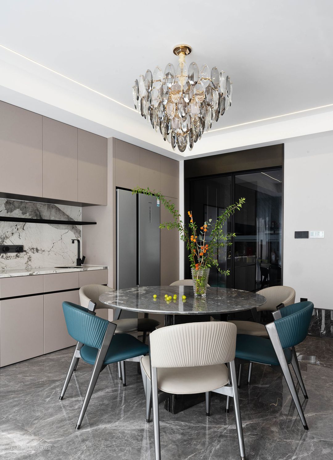 餐厅选了1.58米直径的圆餐桌,搭配白色和蓝色吃皮餐椅,简直配一脸呀。圆形的吊灯也是很吸睛,和餐桌做了呼应。 靠墙定制了嵌入式的冰箱餐边柜,柜子都上的反弹器免拉手设计,简洁中透露着藏不住的高级感。整墙一字型的餐边柜,收纳空间太大了,冰箱放这里还可以分担厨房的收纳压力。餐边柜中间留出的台面,做了一排插座和水吧台,方便后续用一些厨房小家电。#餐厅 #餐桌 #餐边柜