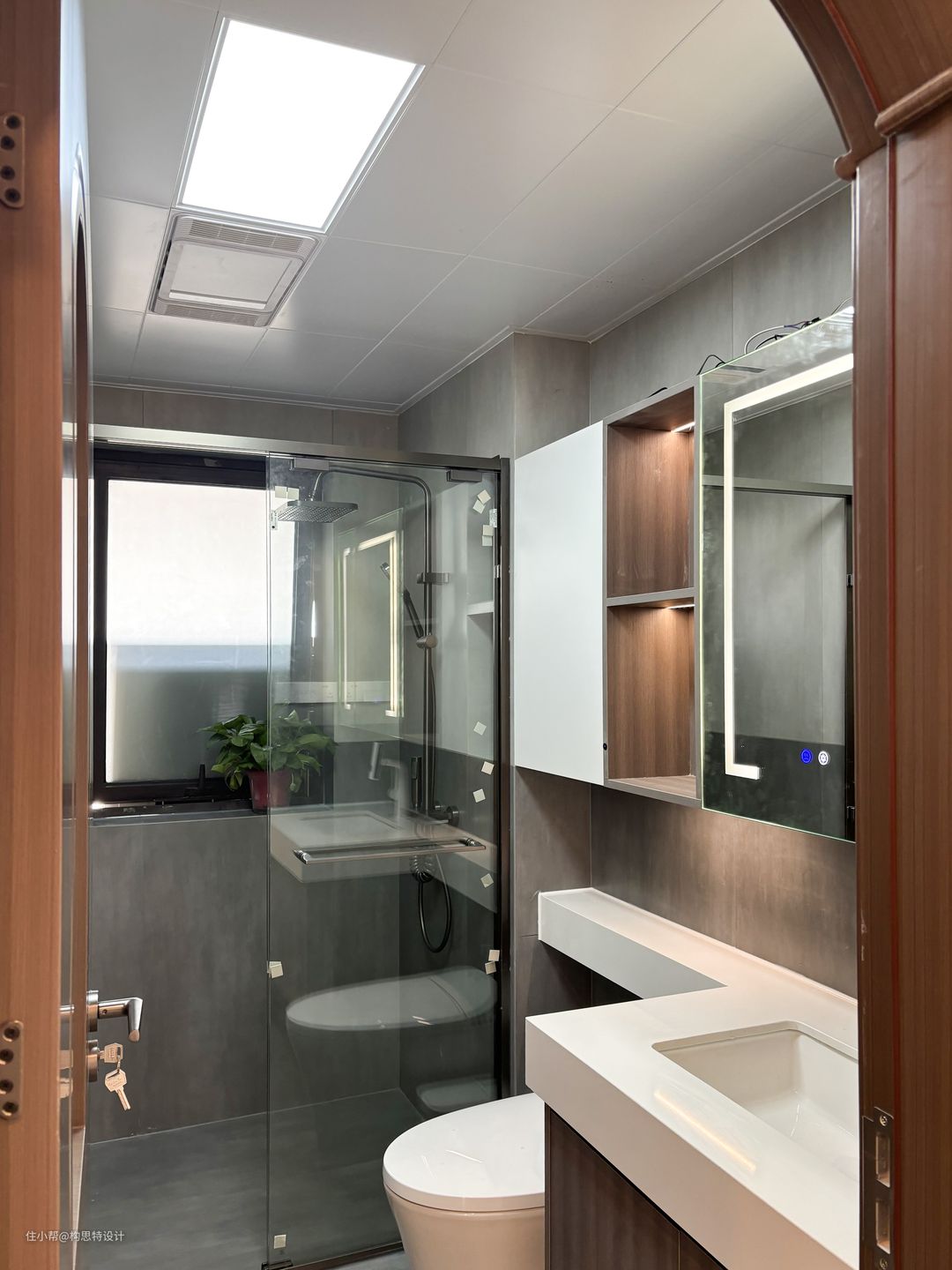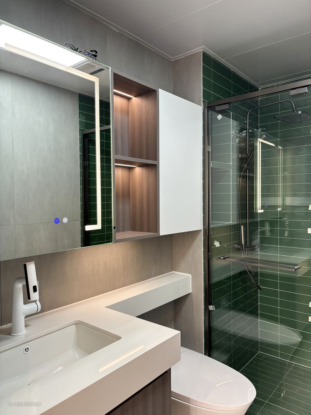 两个卫生间的门都做了胡桃色系的圆拱门,洗漱台做了延申增加了台面储存空间的面积。主卫在淋浴区是用了一个墨绿色的瓷砖,区分与外卫。