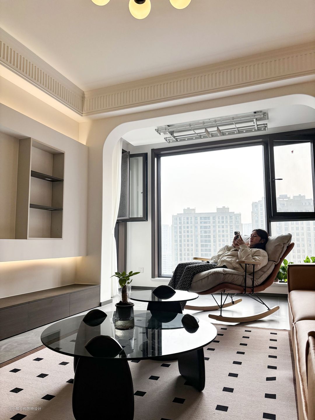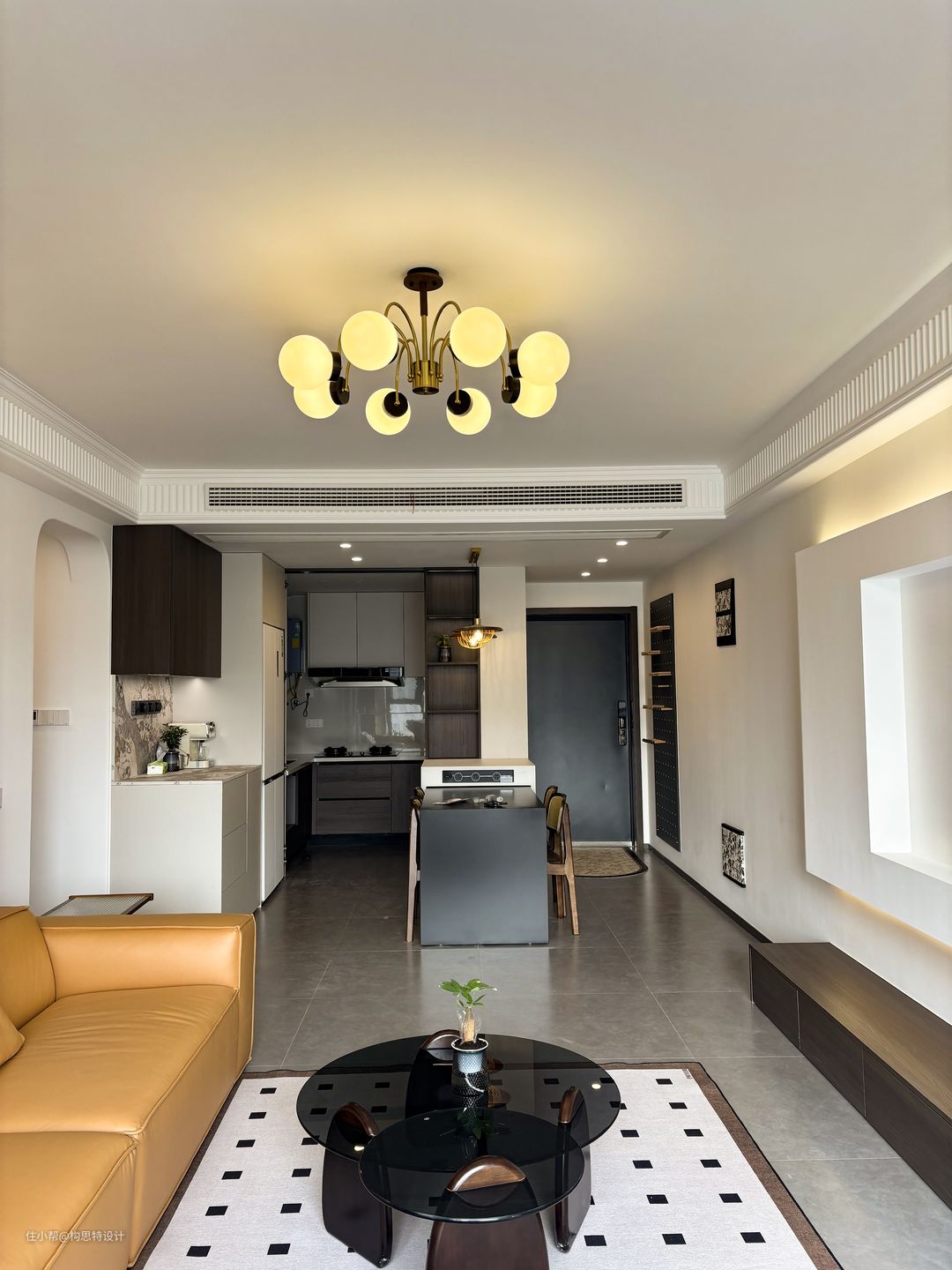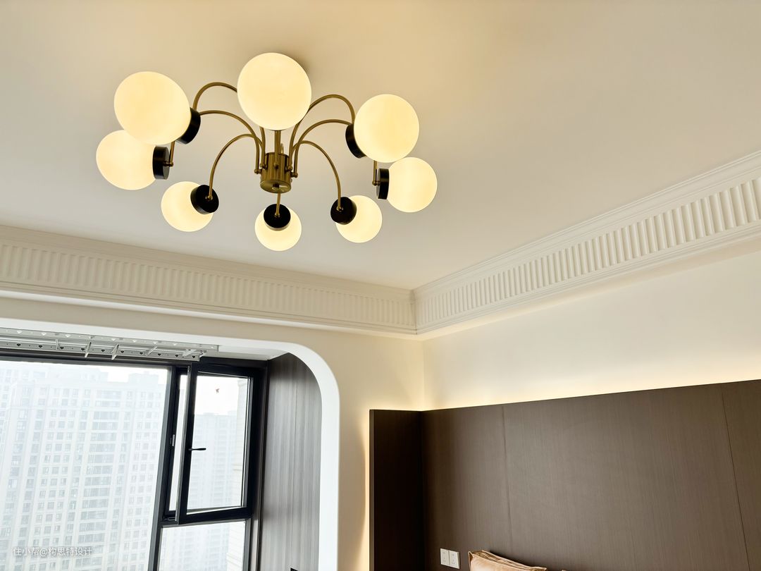 电视背景墙朝向入户处做了弧线,避免直线太过于直率而不温和。上下都做了灯带,更美观一些。沙发的背景墙也是做了一个胡桃色的背景墙加灯带。全屋是一个有主灯的设计,主次分明。使用了一个搓衣板的石膏线,优雅大方