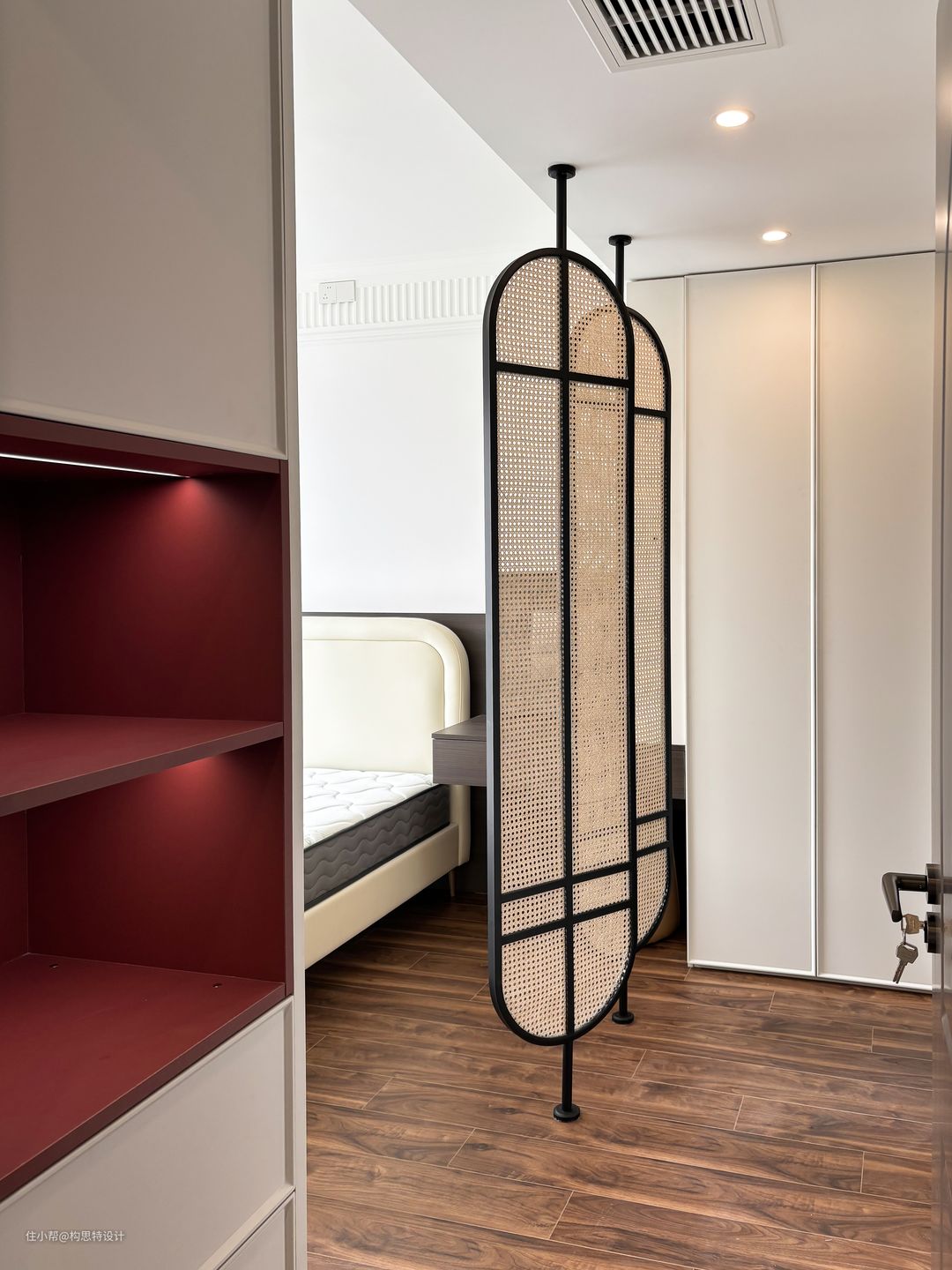 主卧门口的柜子的开放格选择了一个猪肝红的配色,呼应中古风。卧室选择使用了一个复古的屏风来遮挡。整个主卧的储存空间都是在床对面的这一整排的柜子,柜子上做了开口,后面安装可升降的幕布来配套的使用投影仪。梳妆台做了一个倒圆弧的长虹玻璃。都加上了感应式灯带。