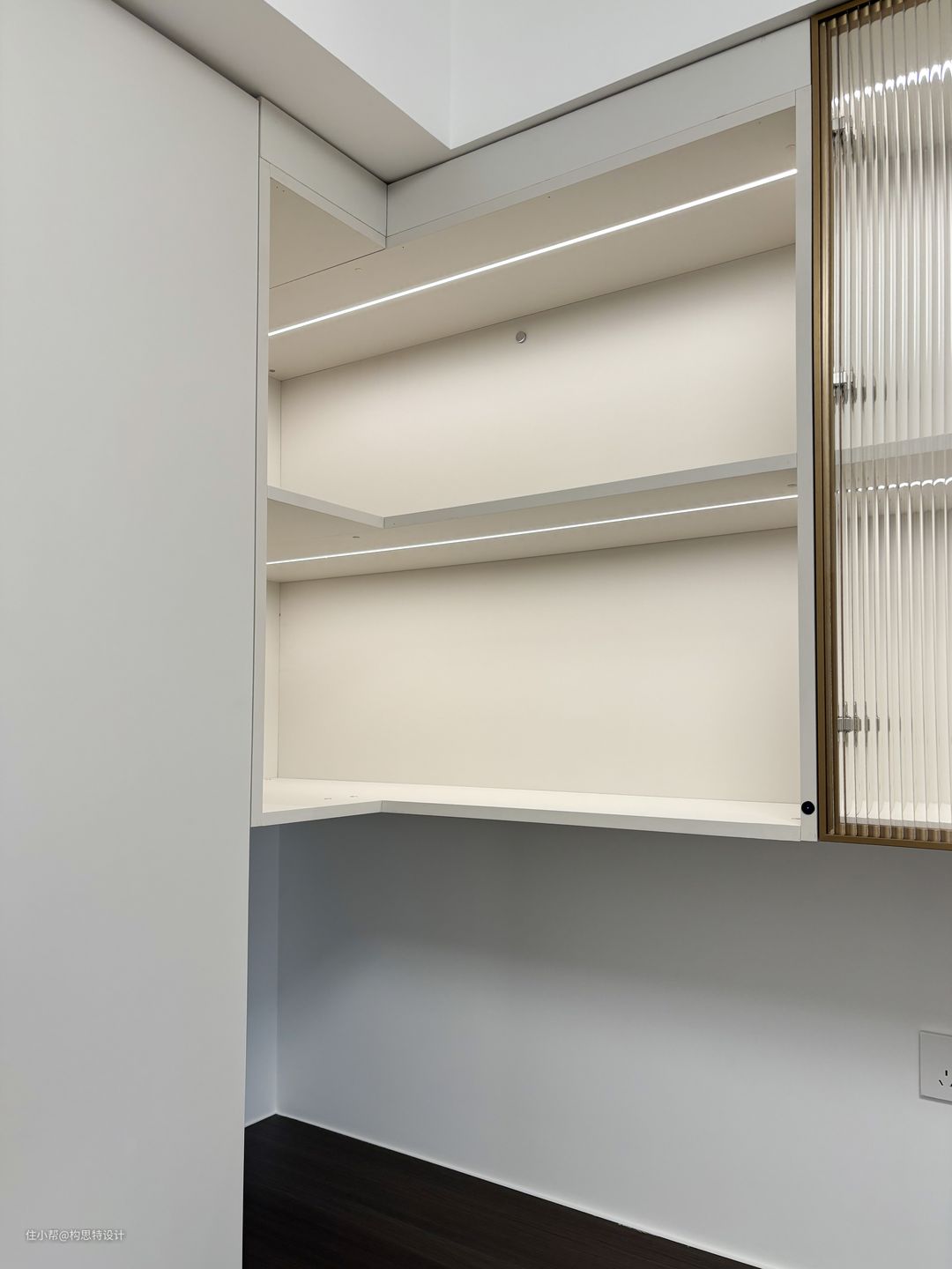 厨房做了一个可开放可不开放的厨房,因为燃气的原因,是必须要有一个厨房的门,但是我们因为想要空间显得大一点,将厨房的移门隐藏进了柜体里,达到半开放。在整个厨房的设计中,都是充分利用另外每一块地方,增加储藏空间。