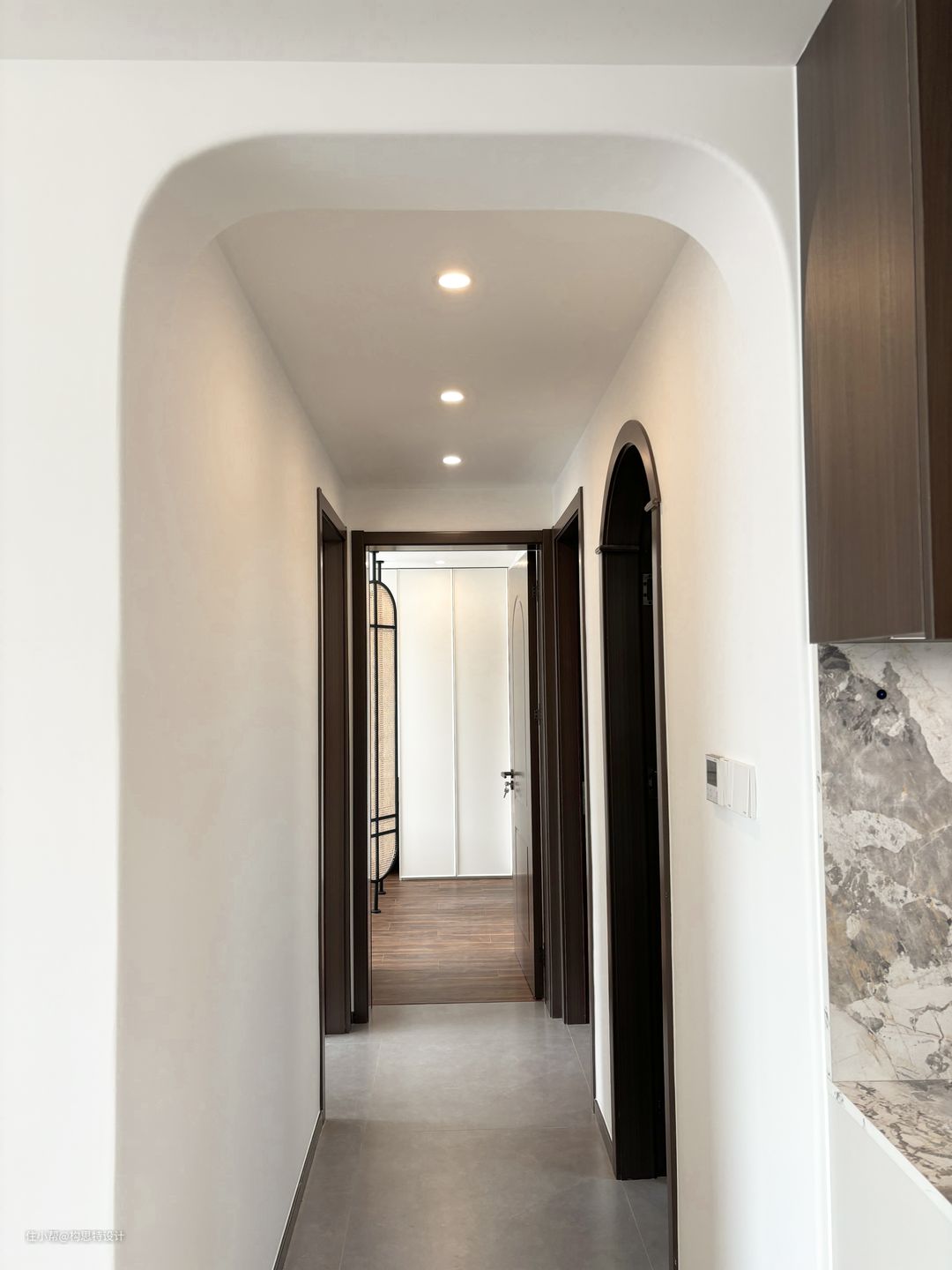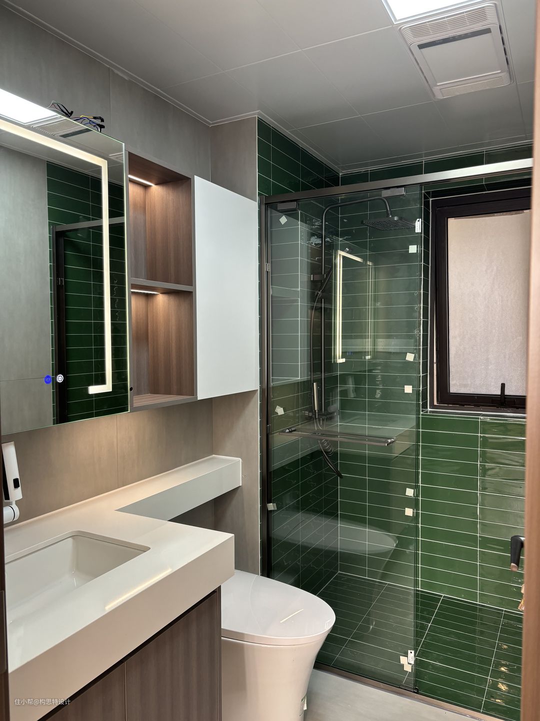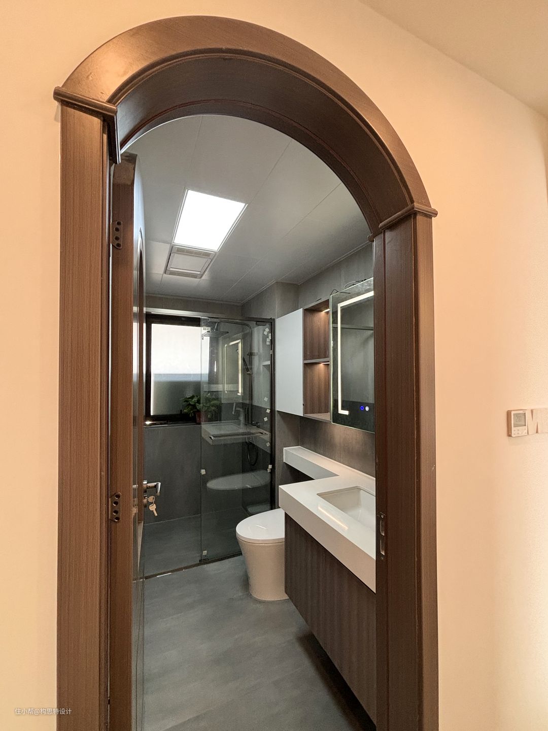 两个卫生间的门都做了胡桃色系的圆拱门,洗漱台做了延申增加了台面储存空间的面积。主卫在淋浴区是用了一个墨绿色的瓷砖,区分与外卫。