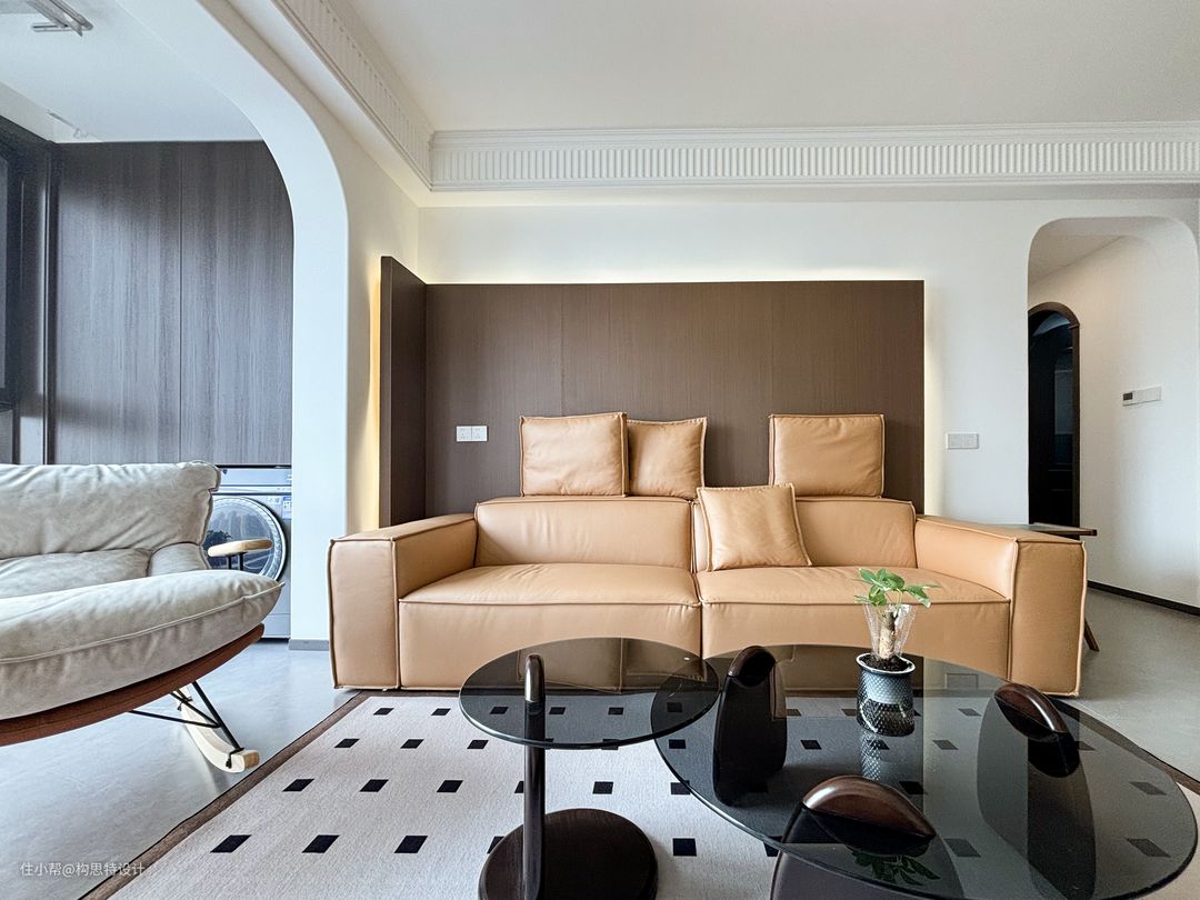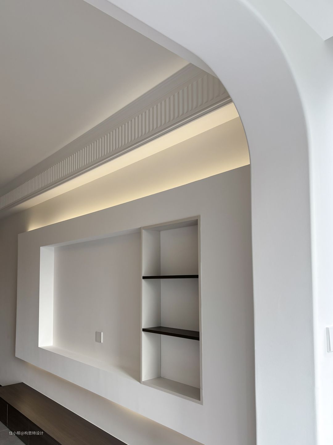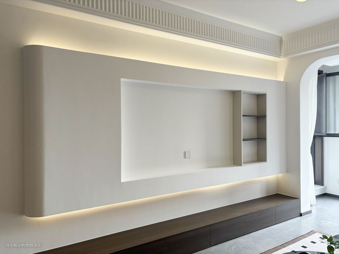 电视背景墙朝向入户处做了弧线,避免直线太过于直率而不温和。上下都做了灯带,更美观一些。沙发的背景墙也是做了一个胡桃色的背景墙加灯带。全屋是一个有主灯的设计,主次分明。使用了一个搓衣板的石膏线,优雅大方