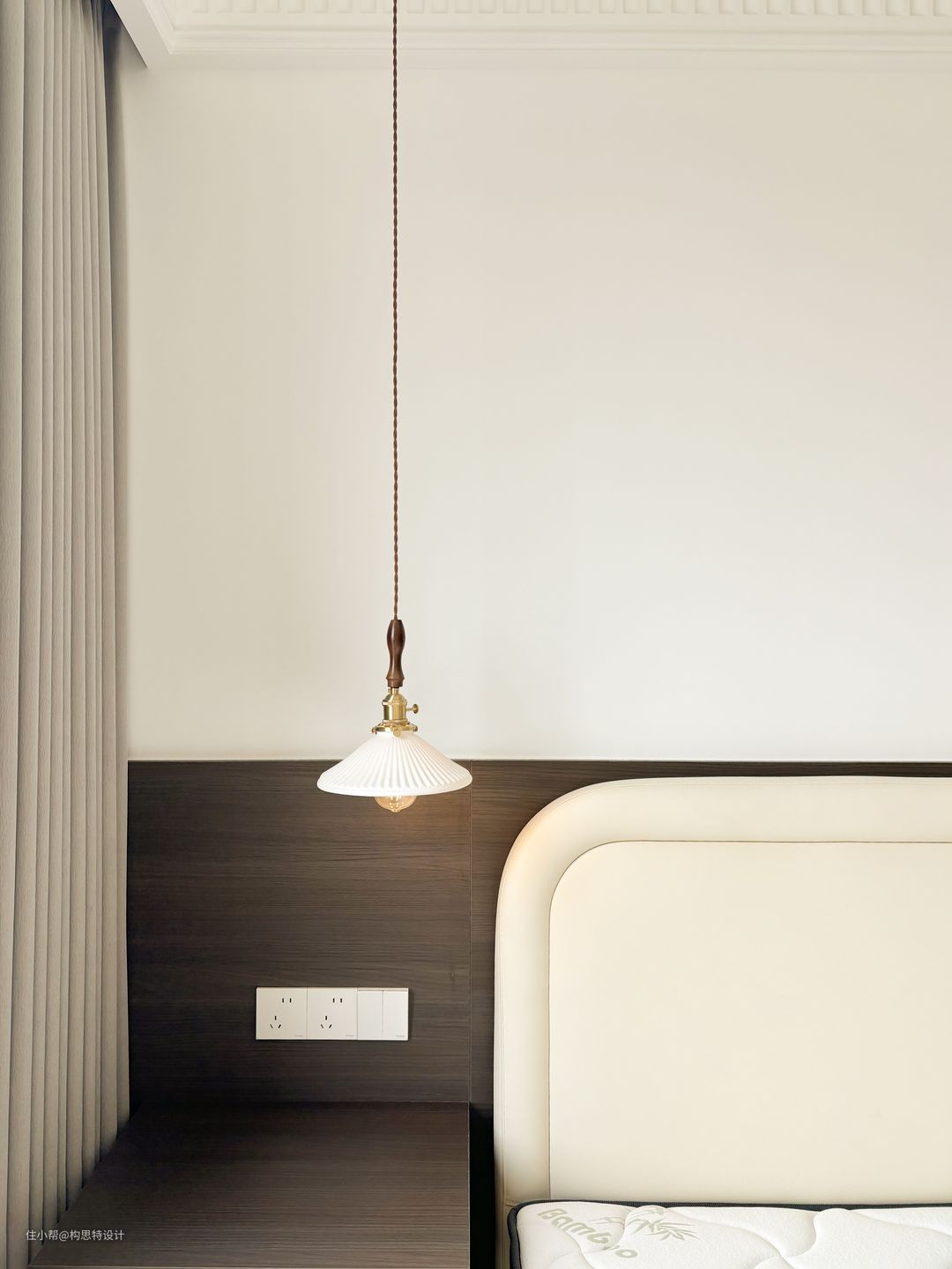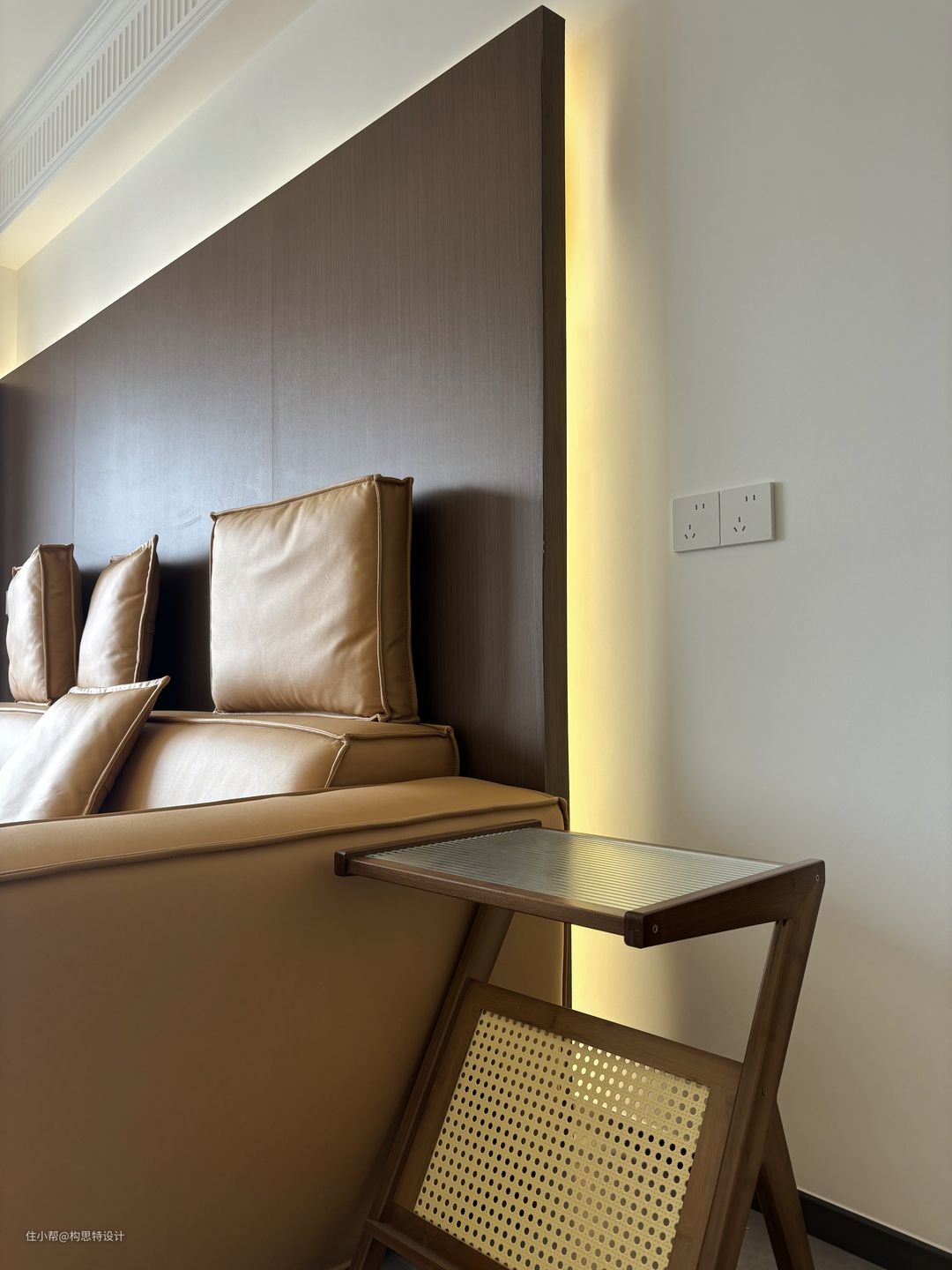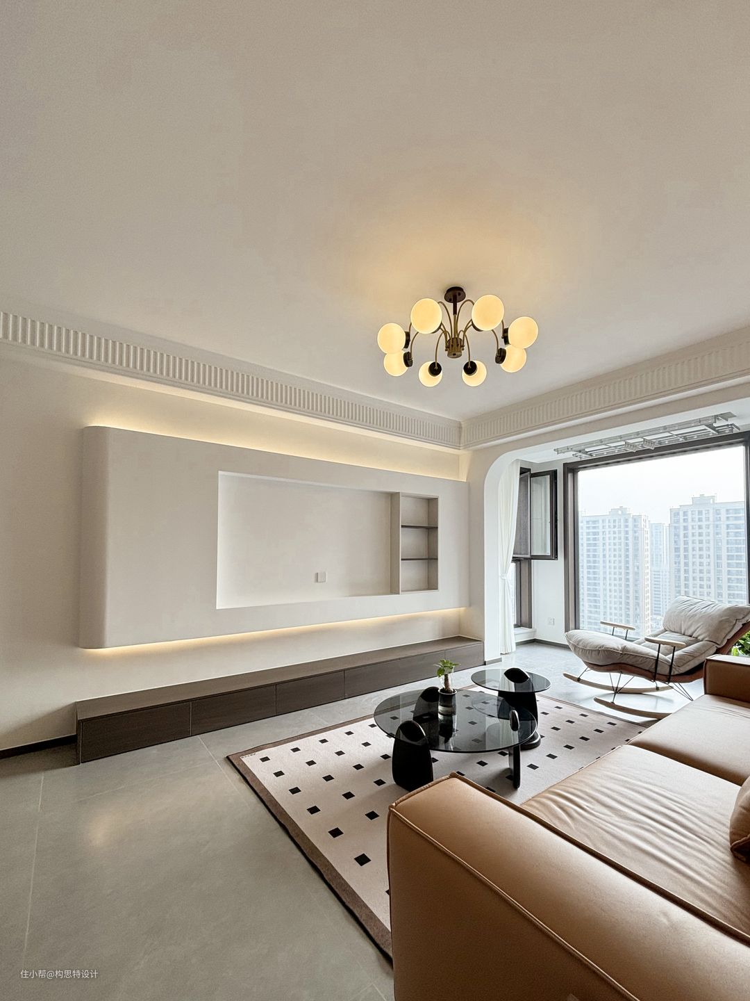 电视背景墙朝向入户处做了弧线,避免直线太过于直率而不温和。上下都做了灯带,更美观一些。沙发的背景墙也是做了一个胡桃色的背景墙加灯带。全屋是一个有主灯的设计,主次分明。使用了一个搓衣板的石膏线,优雅大方
