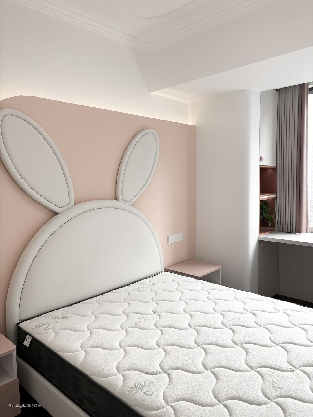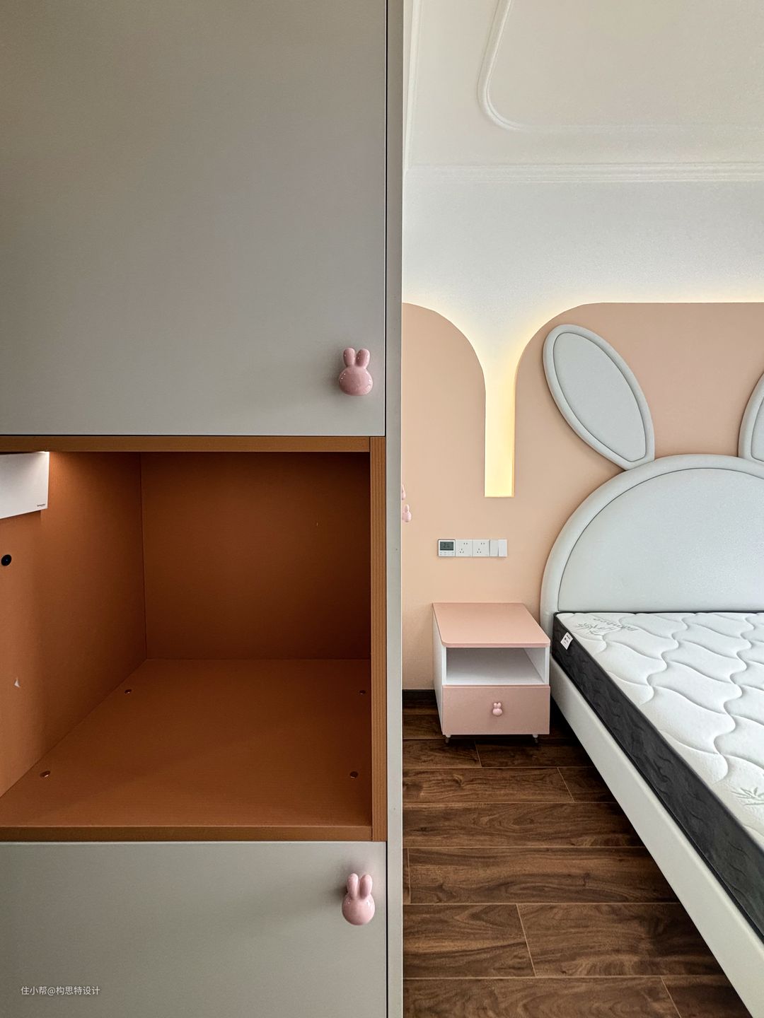 整个房间都是一个比较活泼可爱的形象。床头做了一个兔子的背景墙,打上了灯带,入门处的柜子用了一个橘色来达到活泼的气氛。整个房间柜子的开关都是用的一个小兔子的形象。写字台旁边的柜子储存量也是十分充足的