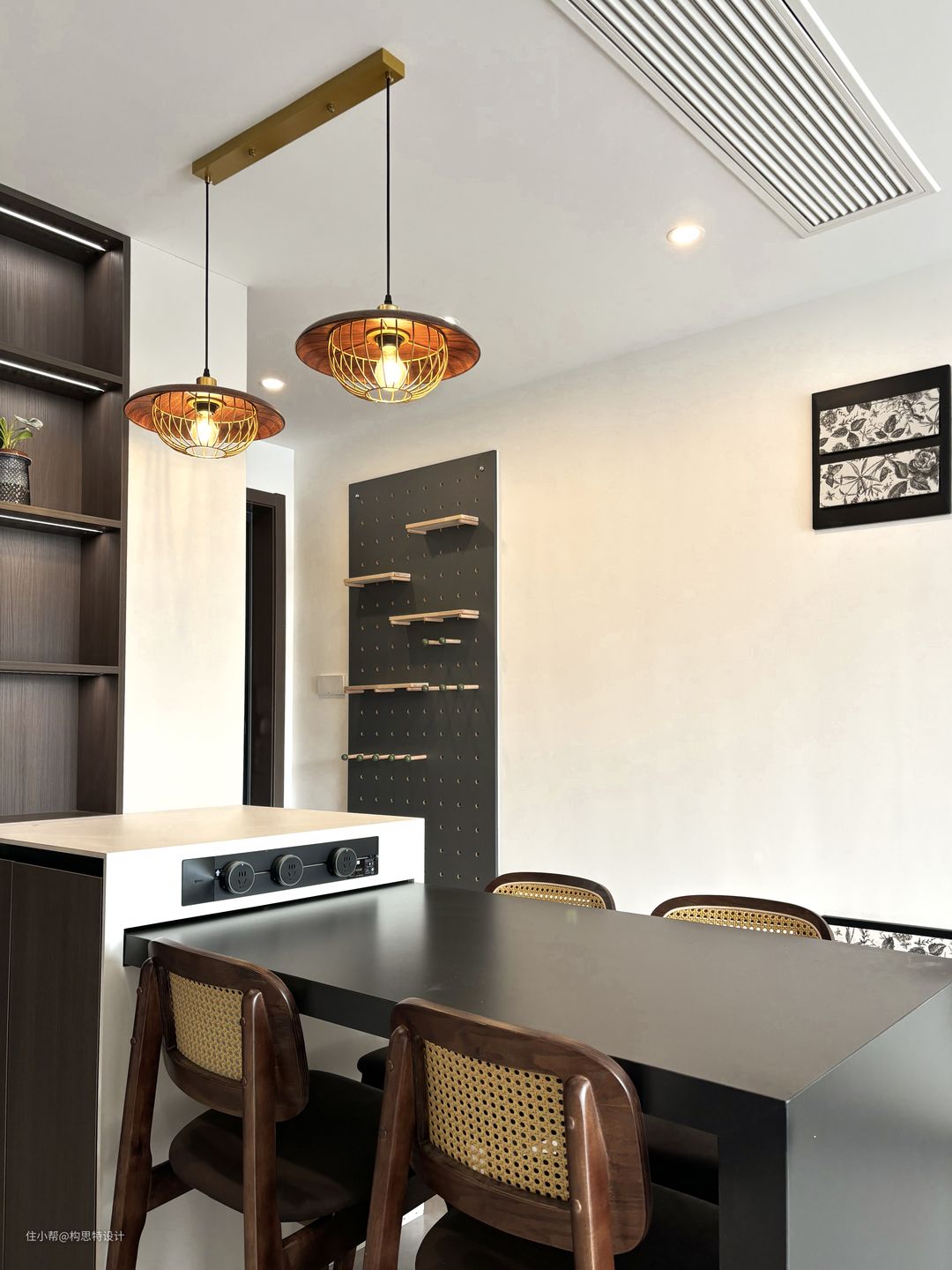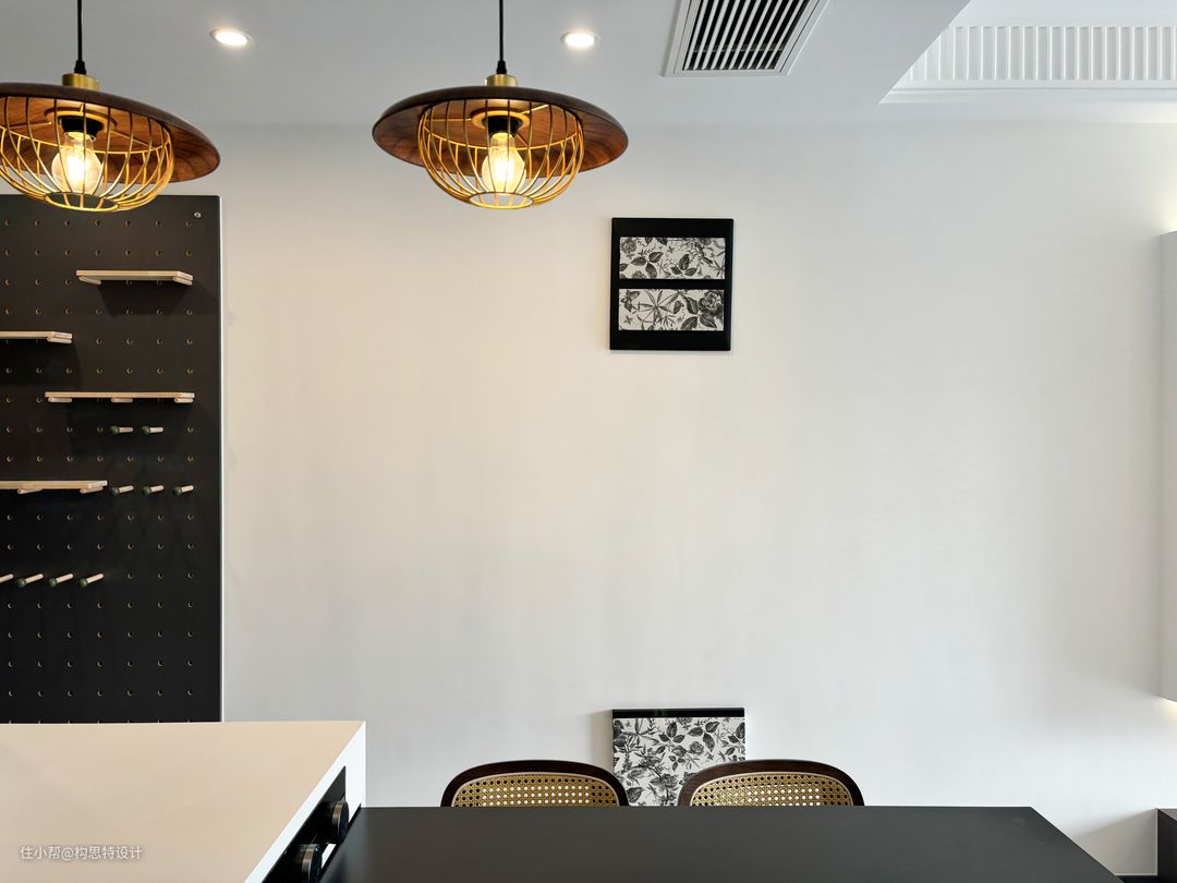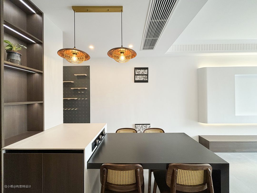 餐厅靠在厨房的边上,也靠近玄关柜。选用的餐桌是一个岛台,可以推进去也可以拉出来,方便使用。岛台的颜色选的也是一个中古色系的拼接。两个吊灯的选择将整个色调变暖,更为中古。