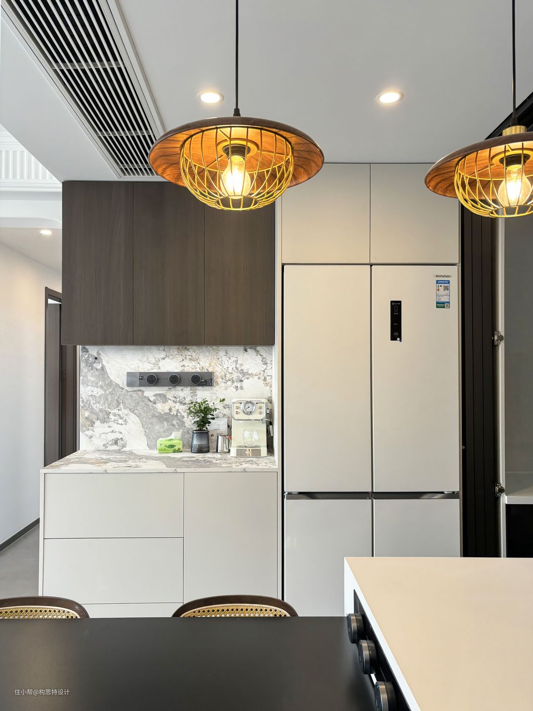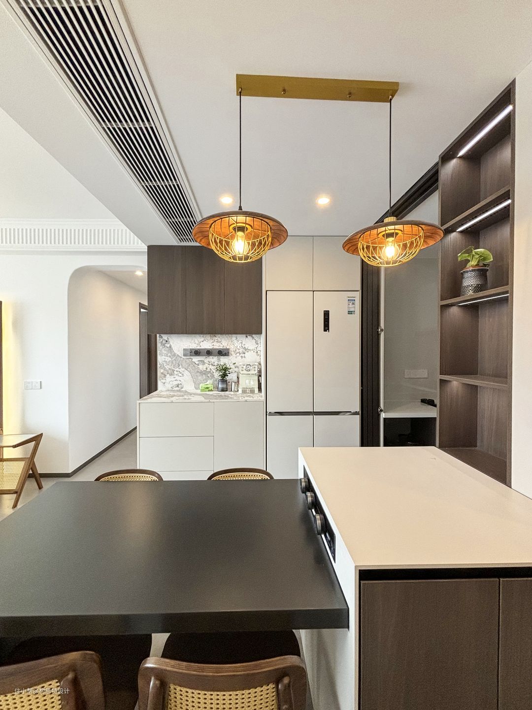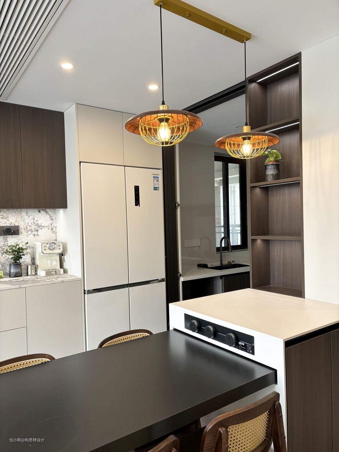 餐厅靠在厨房的边上,也靠近玄关柜。选用的餐桌是一个岛台,可以推进去也可以拉出来,方便使用。岛台的颜色选的也是一个中古色系的拼接。两个吊灯的选择将整个色调变暖,更为中古。
