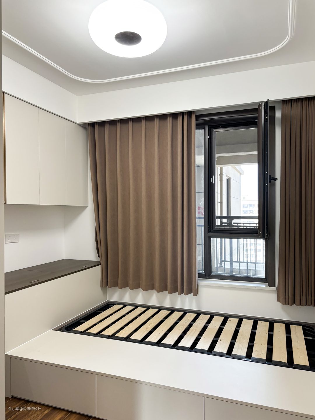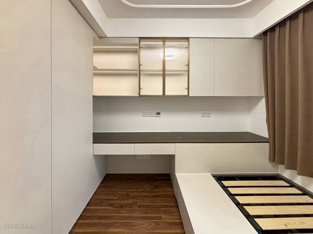 横向的长书桌,可以办公也可以学习。有客人来也可以铺上床休息。