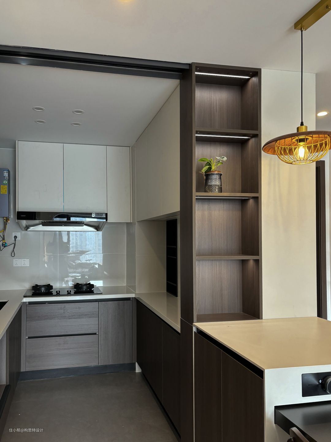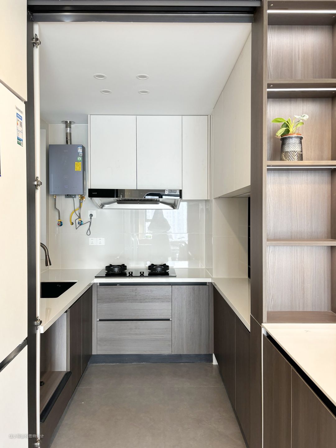 厨房做了一个可开放可不开放的厨房,因为燃气的原因,是必须要有一个厨房的门,但是我们因为想要空间显得大一点,将厨房的移门隐藏进了柜体里,达到半开放。在整个厨房的设计中,都是充分利用另外每一块地方,增加储藏空间。