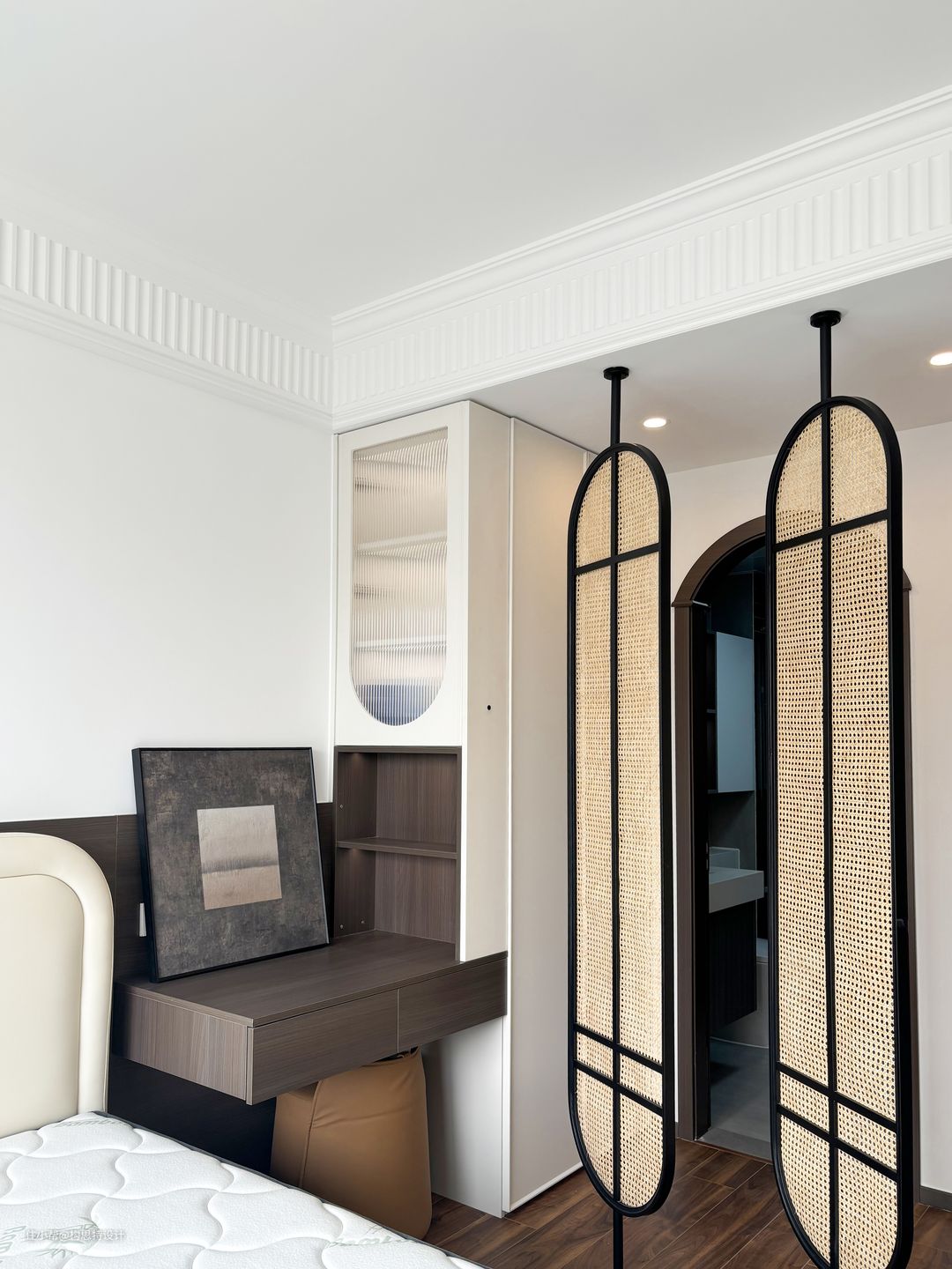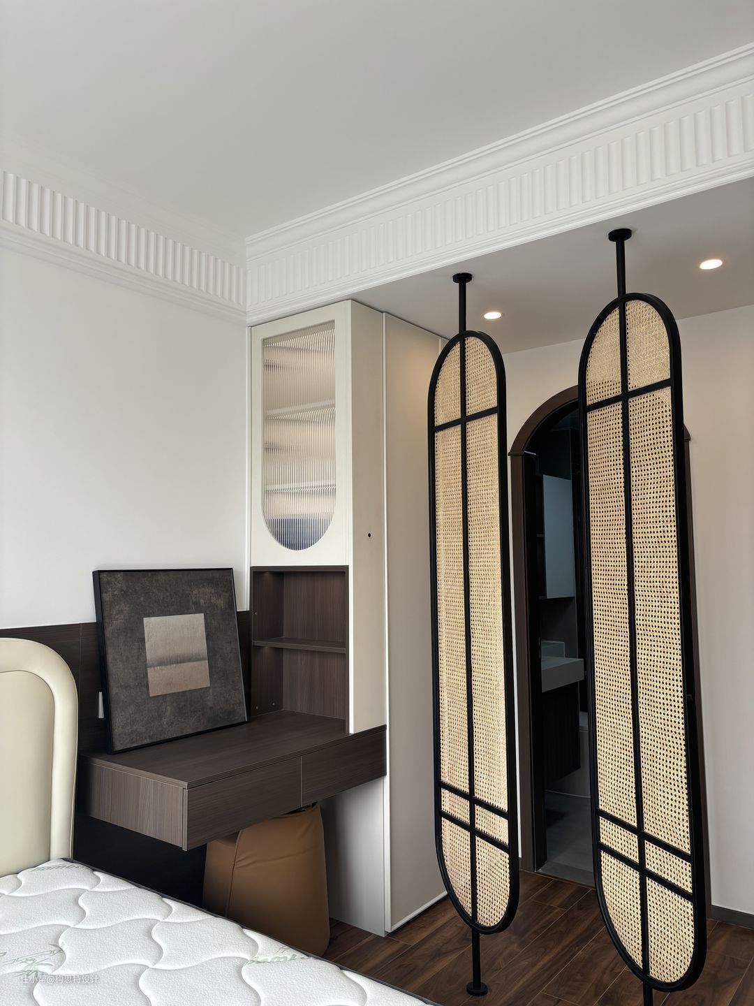 主卧门口的柜子的开放格选择了一个猪肝红的配色,呼应中古风。卧室选择使用了一个复古的屏风来遮挡。整个主卧的储存空间都是在床对面的这一整排的柜子,柜子上做了开口,后面安装可升降的幕布来配套的使用投影仪。梳妆台做了一个倒圆弧的长虹玻璃。都加上了感应式灯带。