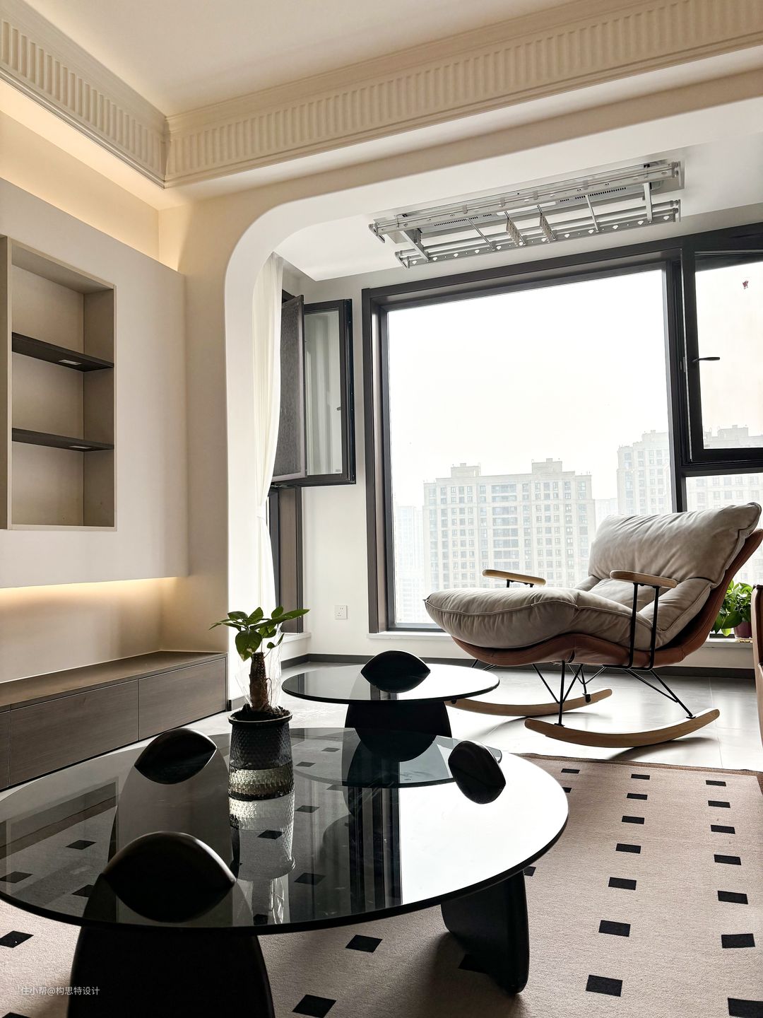 选了一个子母桌,方便移动也不会太过于板重。沙发选了一个姜黄的软皮沙发。靠近阳台部分还加了一个摇摇椅,闲时晒晒太阳。