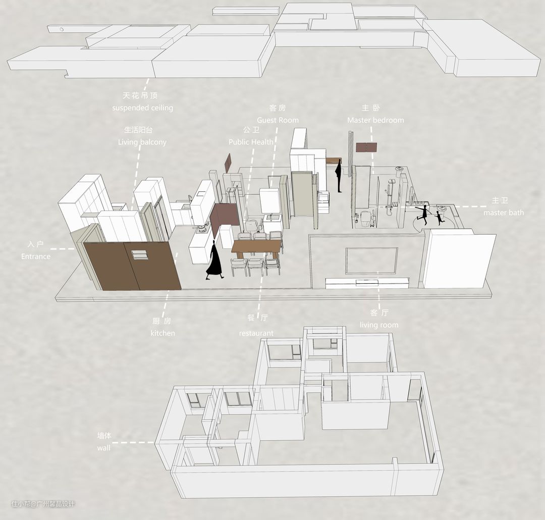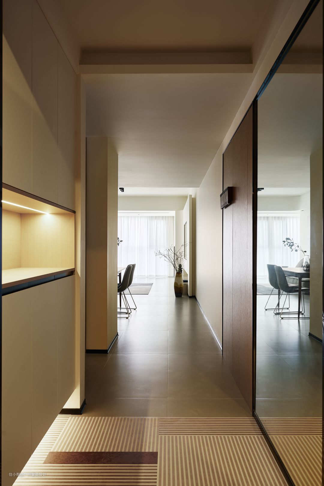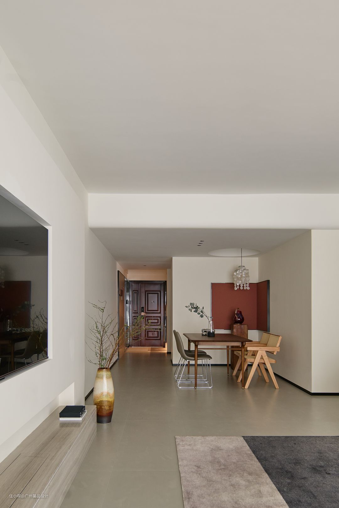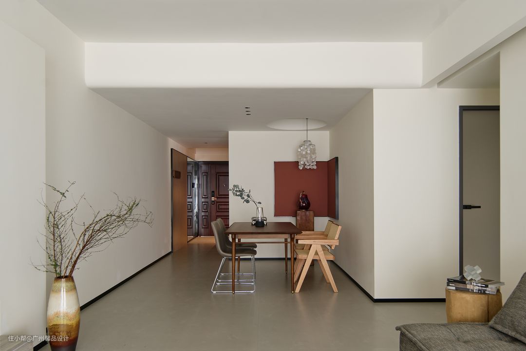 原本是和局促的过道共生,自然少不了小气,不如再“做空”,更精致的去营造墙角的小景,活力的屏风背景板、风起时滴答的风铃灯、饭桌上的“柴米油盐”成了生活的咸淡适中。