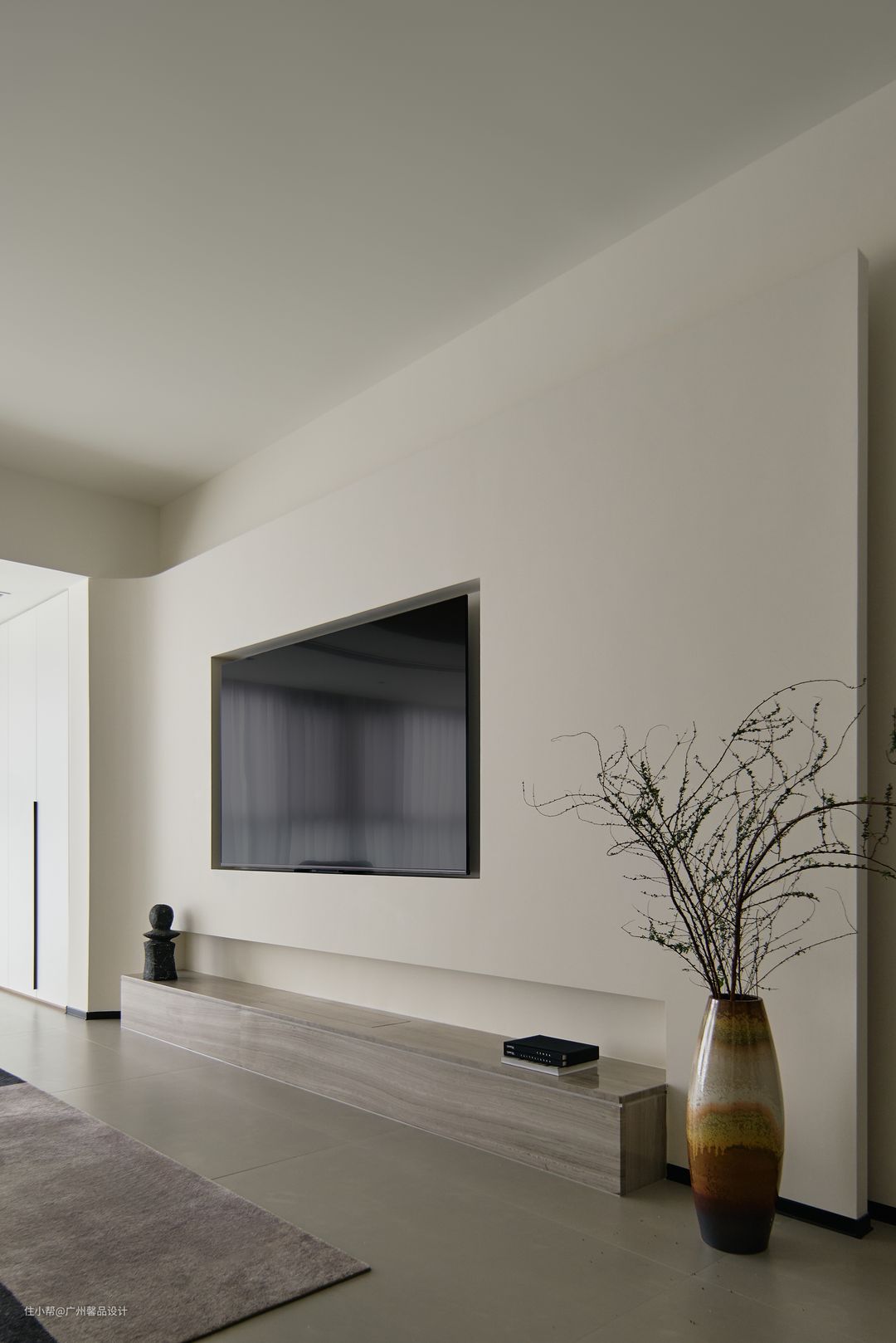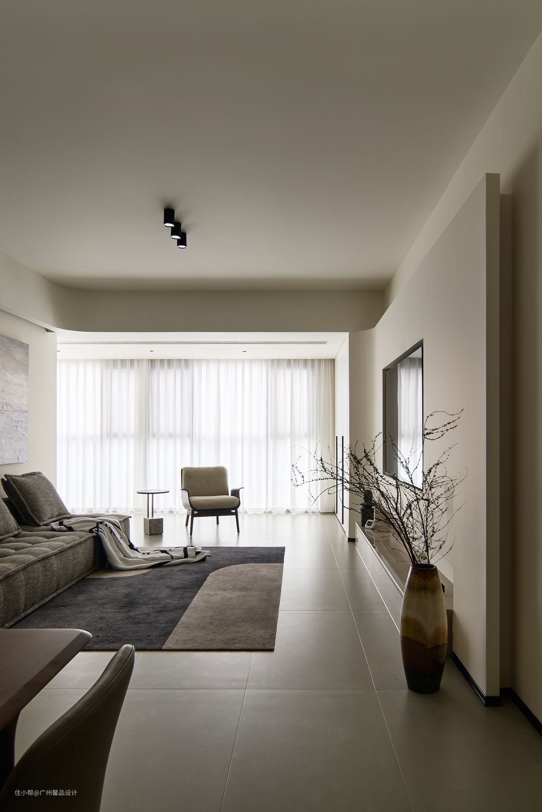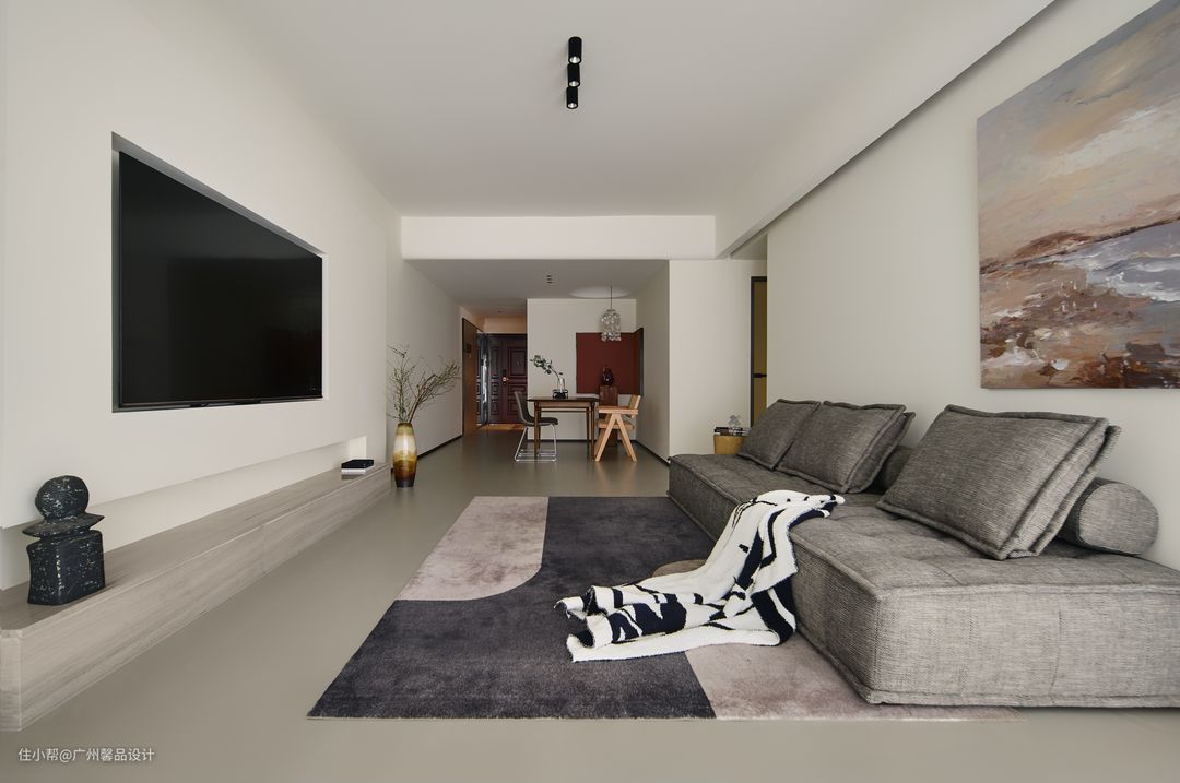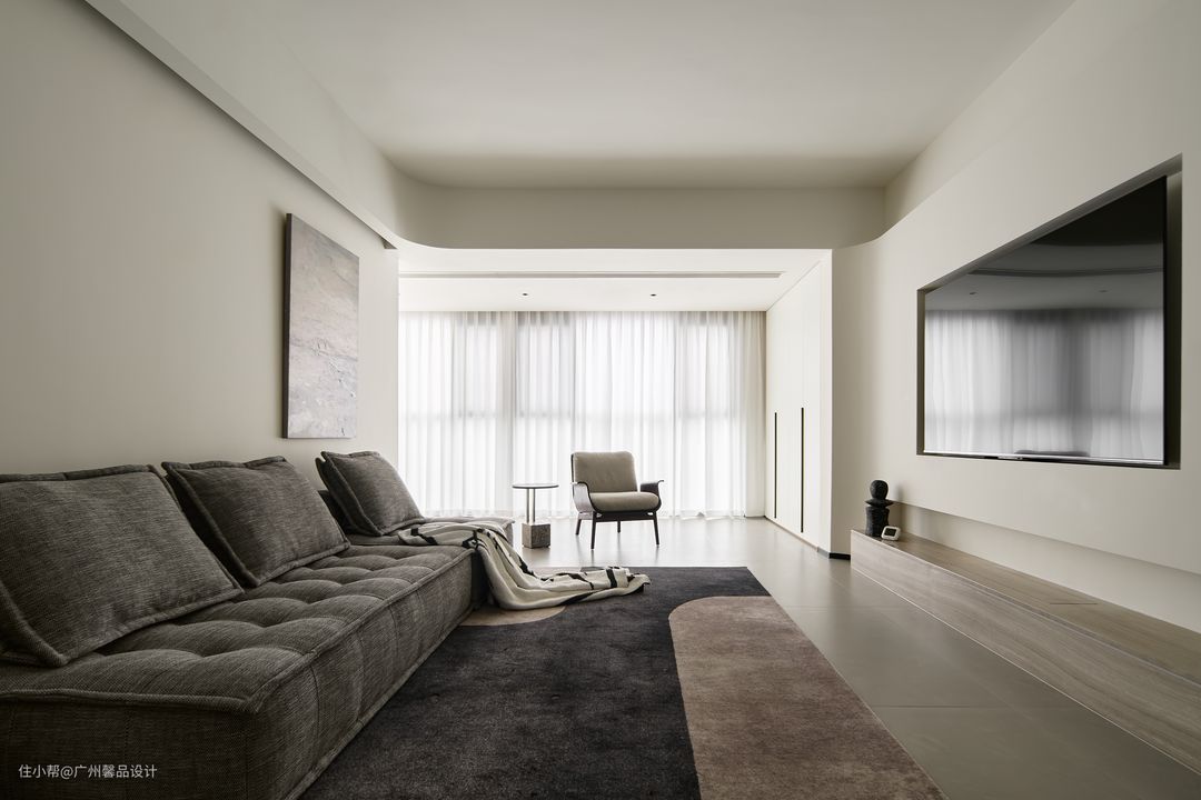 将原本的外阳台包进客厅,整体通透又大气,采光效果极佳,自然光可以毫无保留的洒满整个客厅,还打造一个收纳区以及休闲区,收纳区储放不常用物品,隐藏式设计,既不影响客厅的空间感,也避免局促,「装」同样做到极致。 电视背景墙圆弧形造型也是一大亮点,它增添了一份艺术感和美感,使整个空间更具有家居灵动性,让人感到非常舒适和自在。