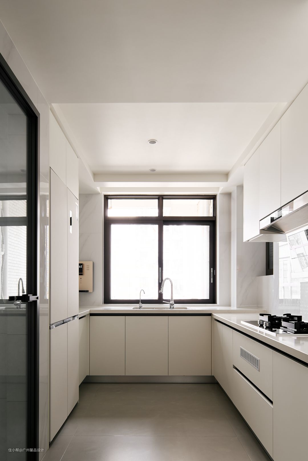原始厨房很小,将厨房与小阳台打通后,借用原多功能房的一小部分面积改造为开放式厨房。U型厨房洗-切-炒-端盘动线流畅、一气呵成,还可以有效的节省空间,中间留出的过道满足两个人一起做饭。