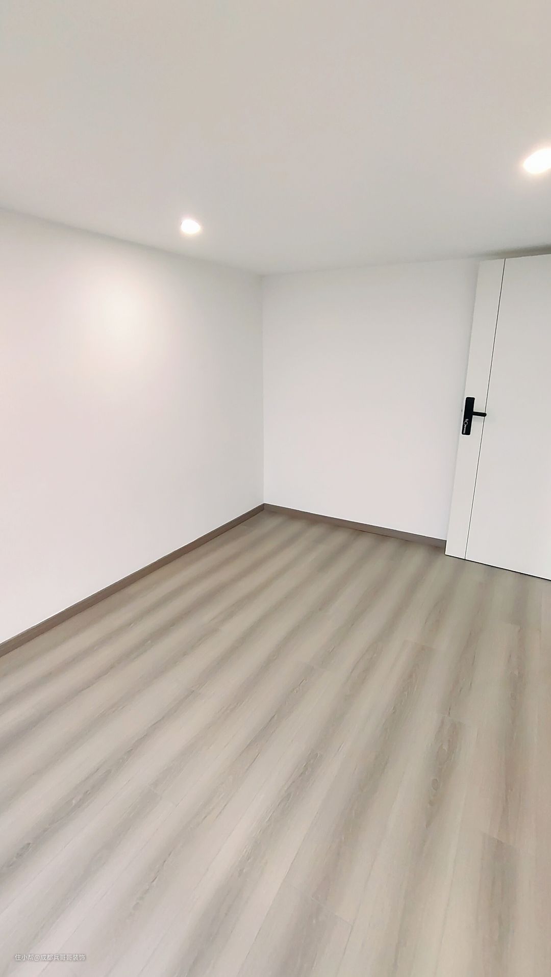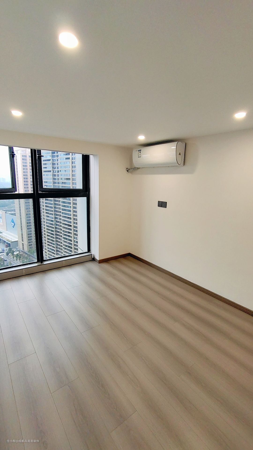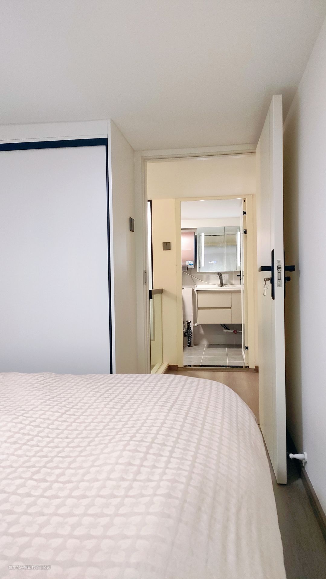 次卧在二楼靠挑空客厅的区域,全屋通铺木地板,衣柜嵌入式推拉门,可以满足四季收纳。卧室侧边全景玻璃窗,可以看到客厅的空间,视觉感很好。