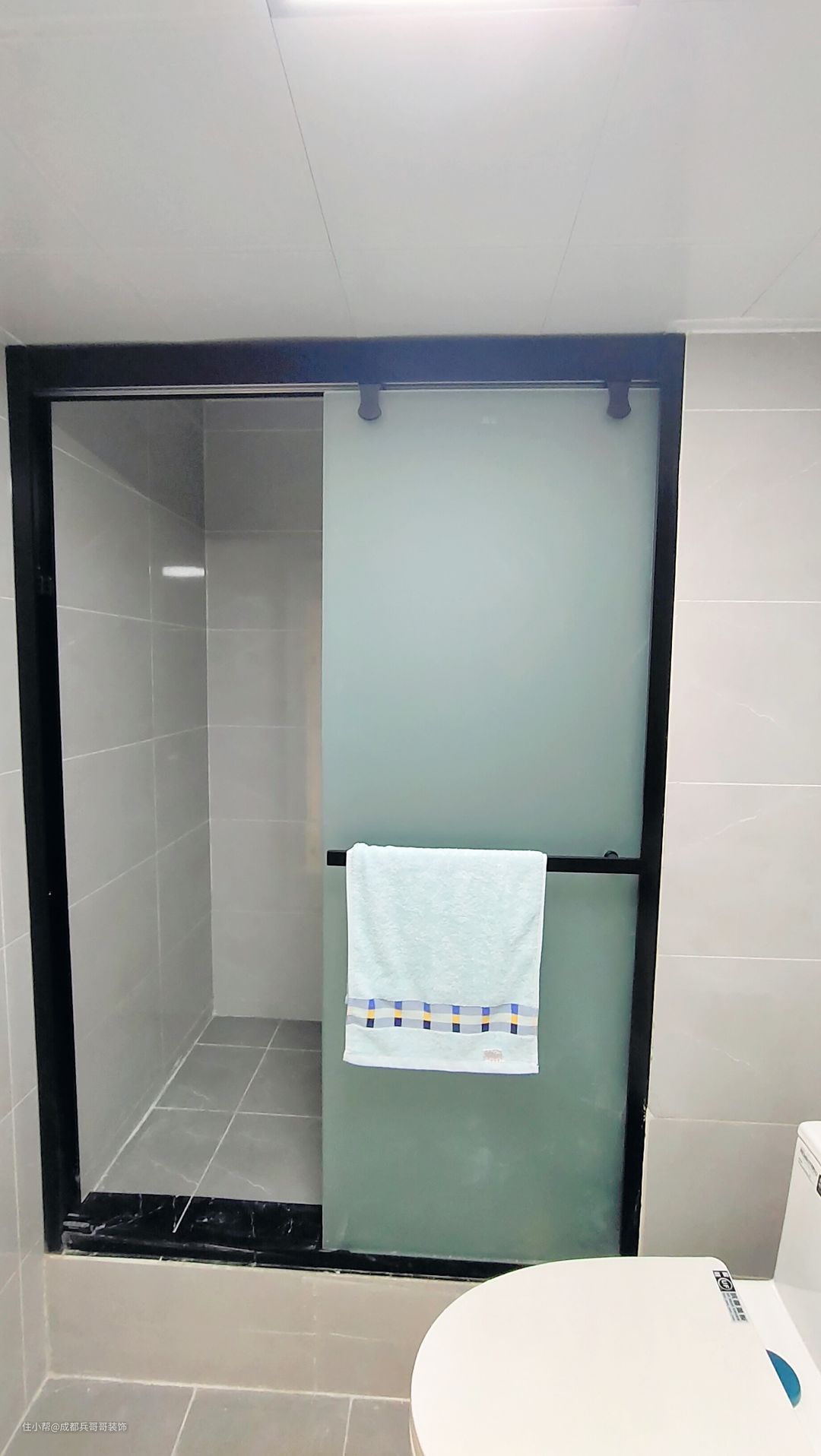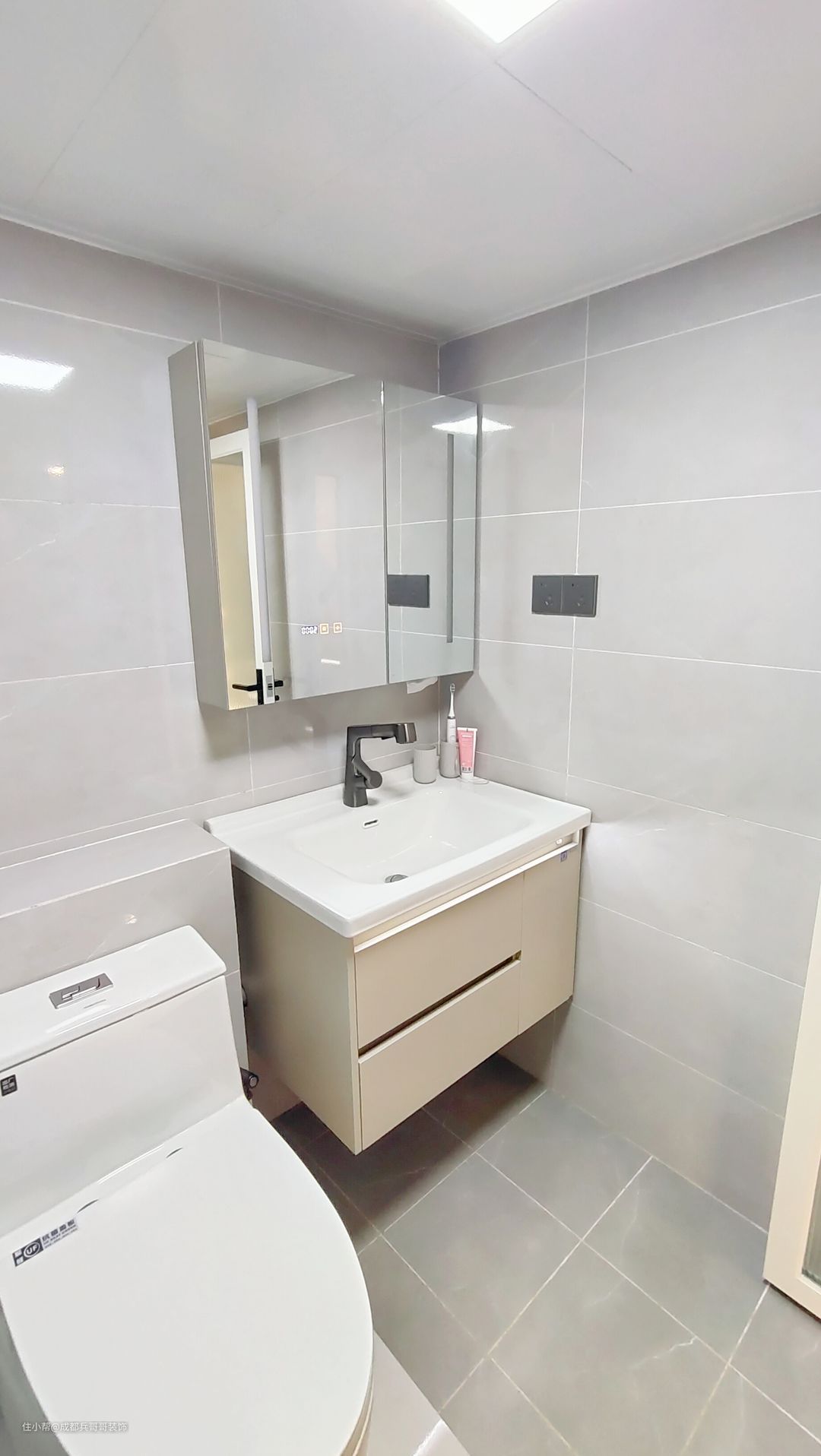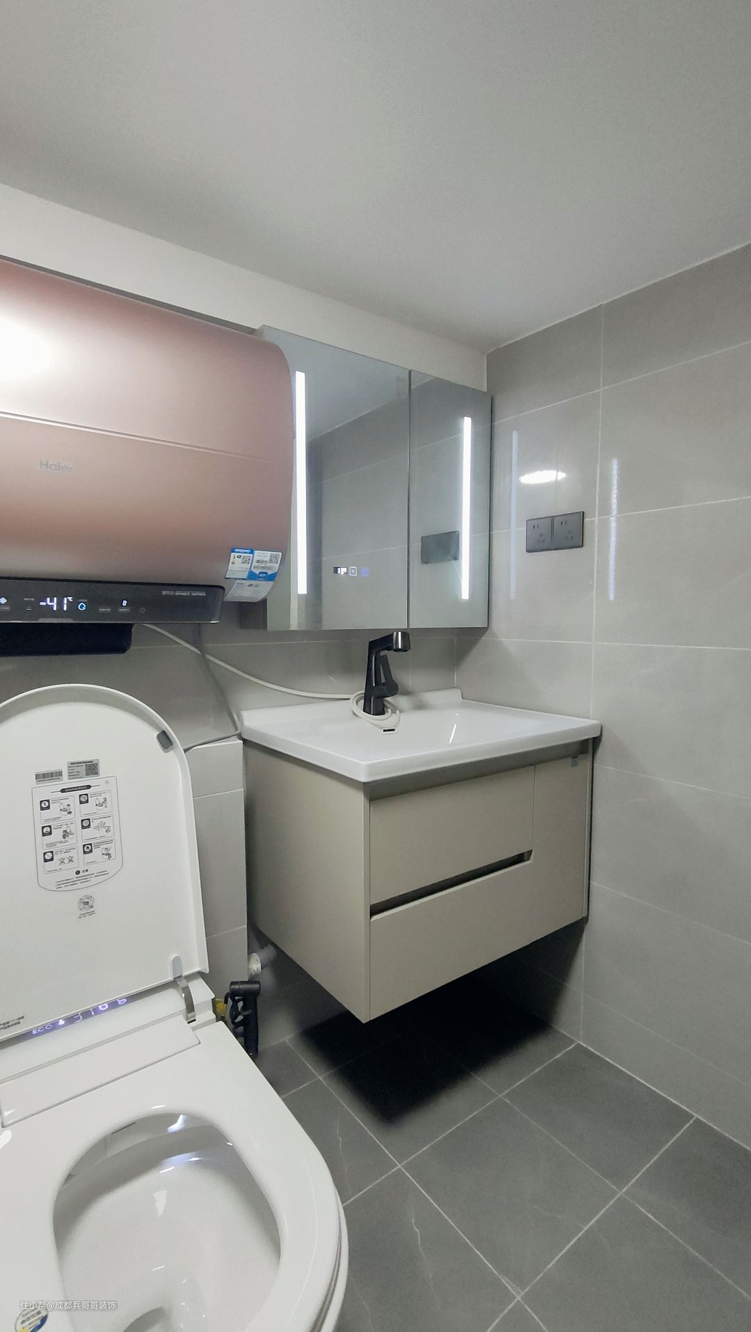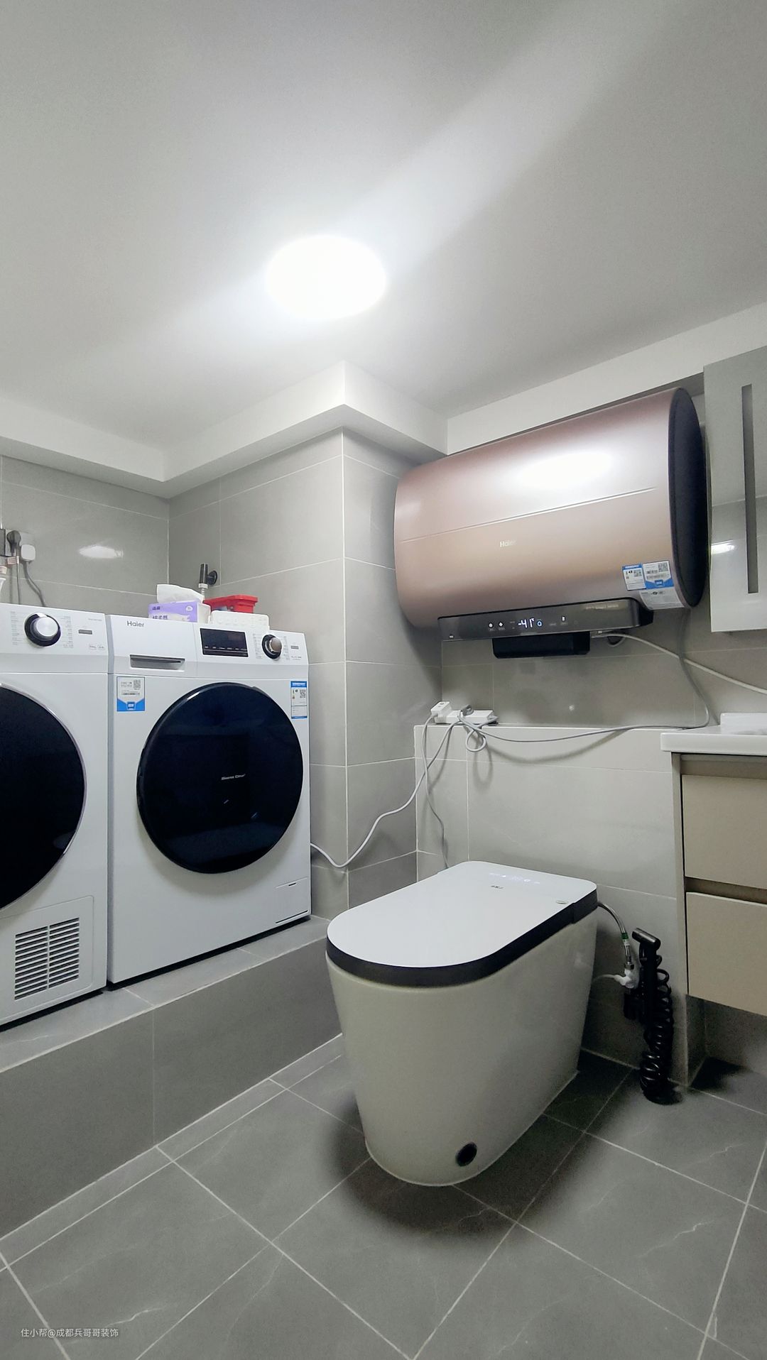 一楼卫生间:干湿分离设计,悬空浴室柜+智能马桶+淋浴间。 二楼卫生间:悬空浴室柜+墙排式马桶+热水器+洗烘一体机,卫生间侧边不砌墙选择全景磨砂玻璃,透光不投影,空间感更好。