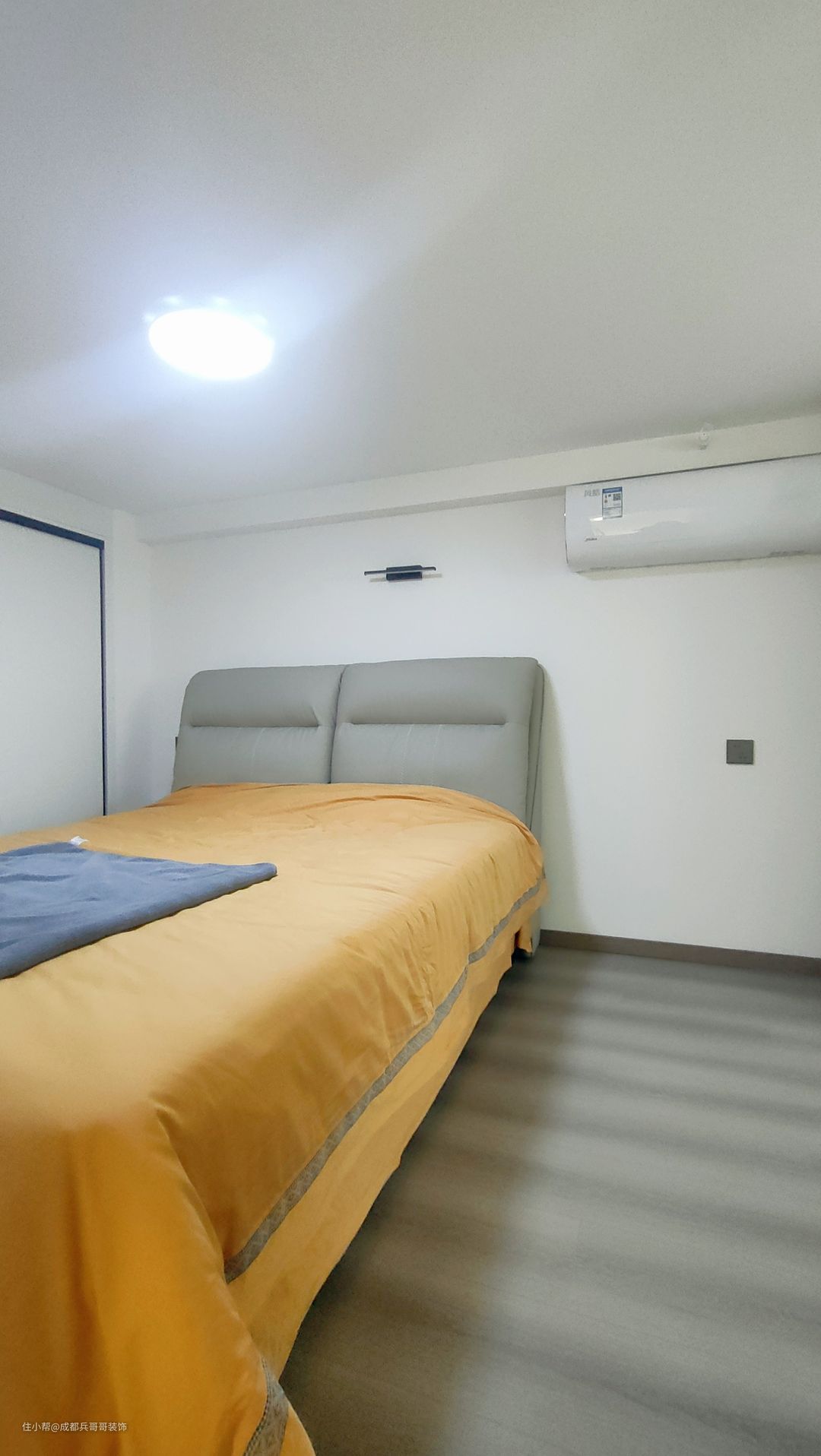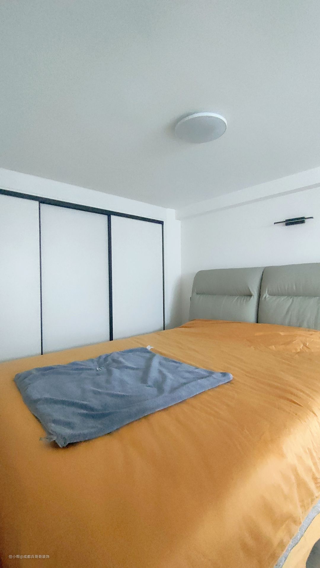 主卧设计在二楼,考虑到私密性,侧边砌的满墙,旁边有通风的窗户,室内通透感不用担心。基本功能考虑到位:1.8米大床+推拉门储物衣柜+床头柜,空间上简约干净、整洁美观。