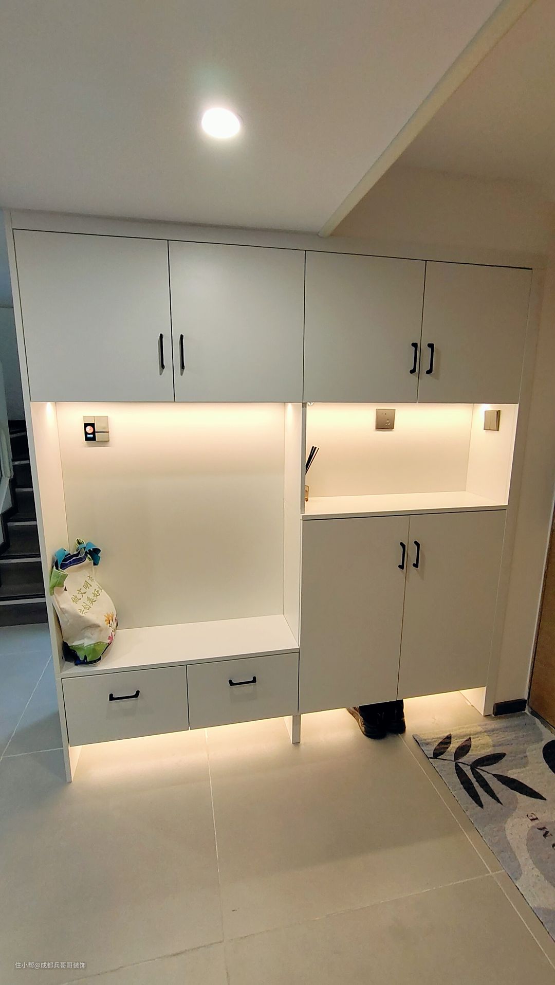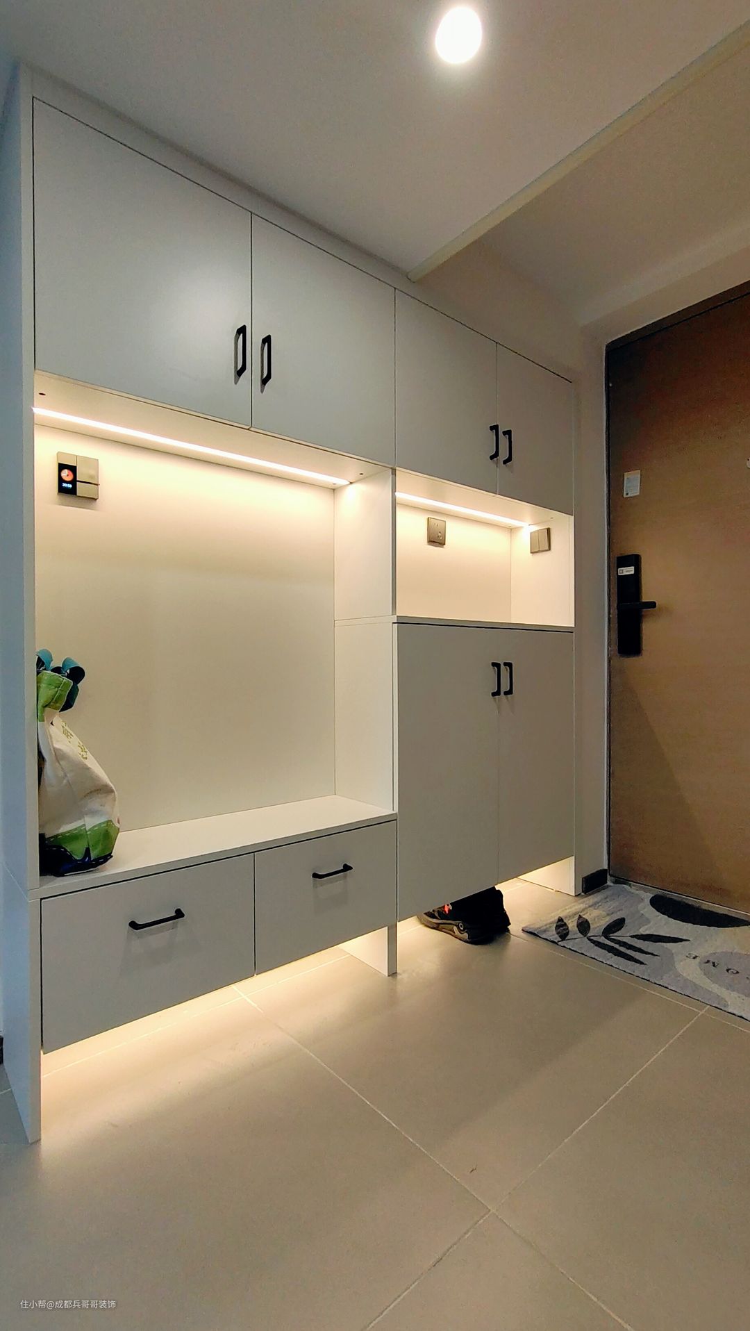 入户空间,右侧玄关鞋柜,安装了嵌入式灯条,感应式设计,拥有换鞋凳,通顶式设计储物十足。