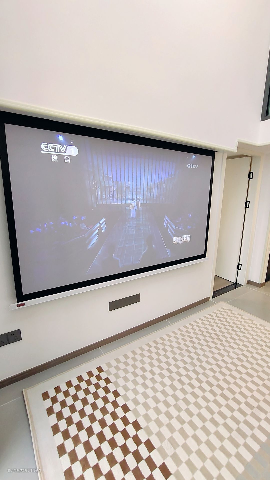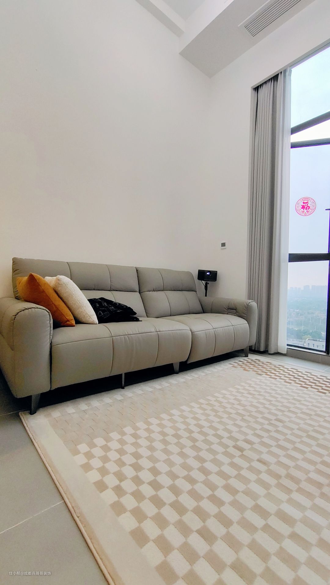 客厅,挑空设计,墙面简单涂刷白色乳胶漆,摆放两米多皮质沙发+投影仪幕布,提前预留了幕布盒子,白天看电视的效果也不错,纵享家庭影院。