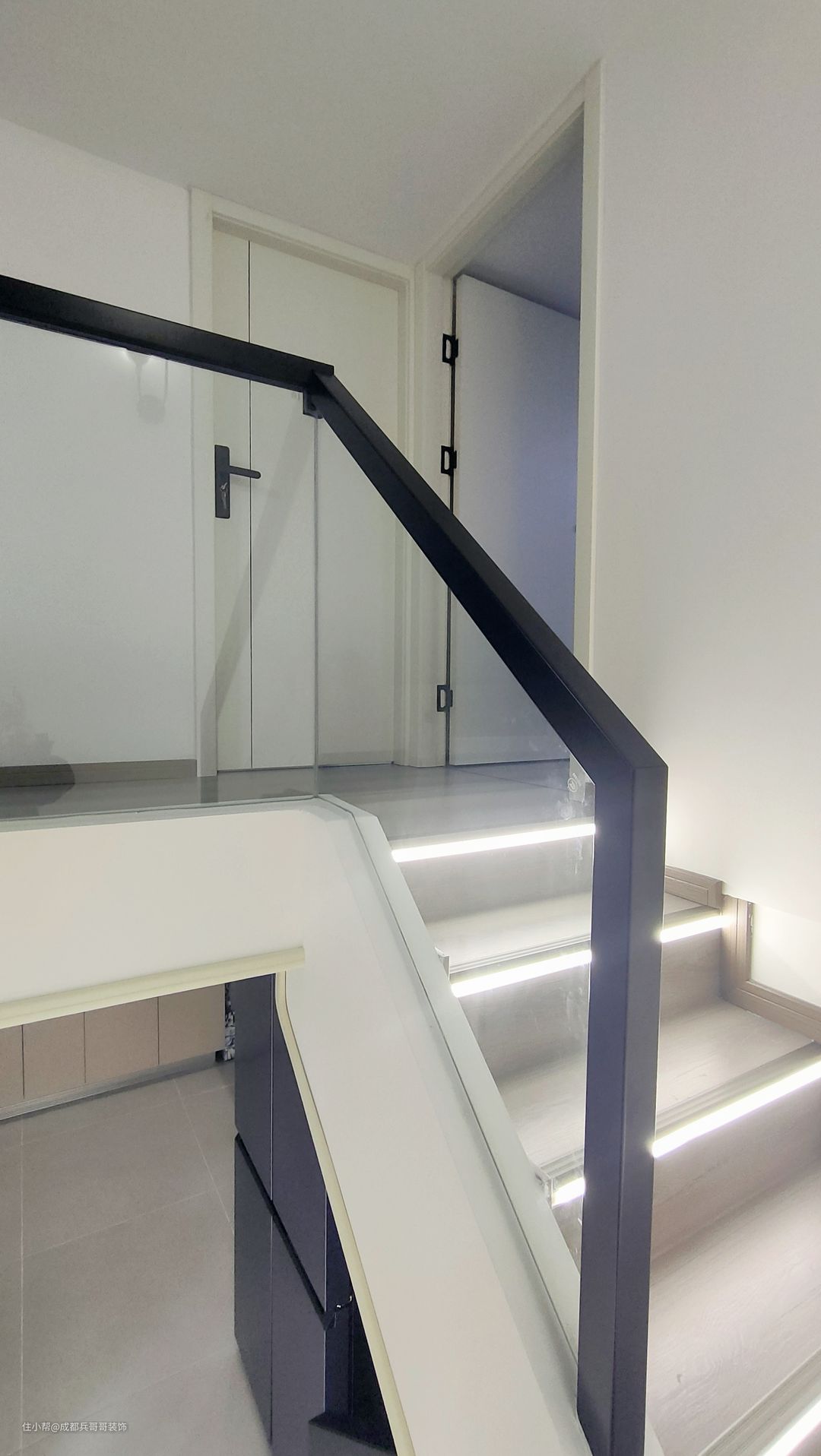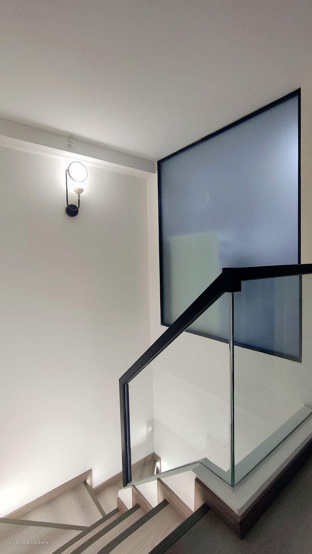 这套loft公寓楼梯选择U形楼梯设计,钢结构搭建而成,花纹钢板+槽钢的搭配,再做木基层+铺贴木地板,嵌入感应灯带+壁灯+实木玻璃扶手,楼梯下方做储物间,简约温馨又实用。