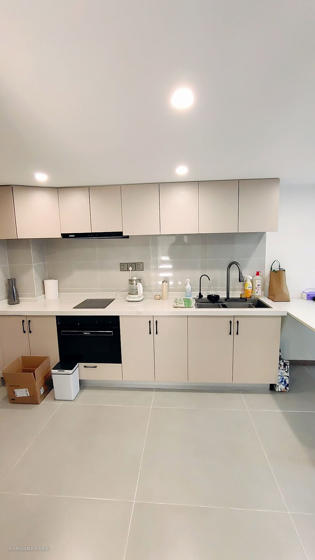 厨房,一字形开放式设计,一整排吊柜+地柜,满足日常储物收纳功能。嵌入了洗碗机和电磁炉,上方吸顶式抽油烟机,水盆是台中盆,安装了抽拉式水龙头,日常清洁十分方便。