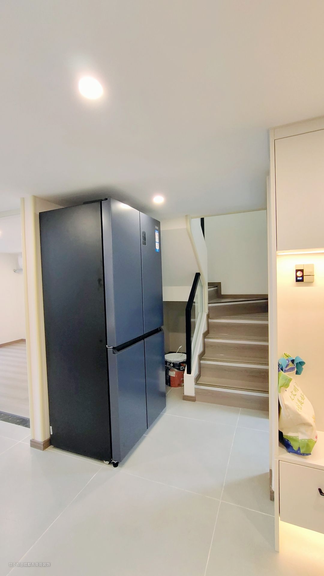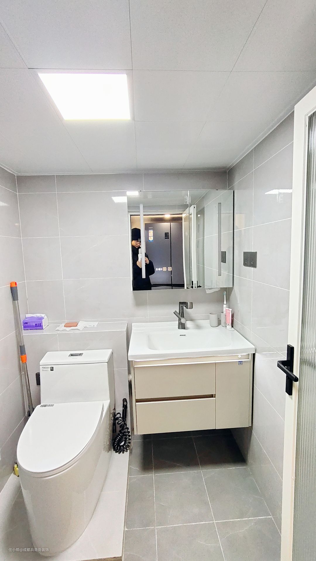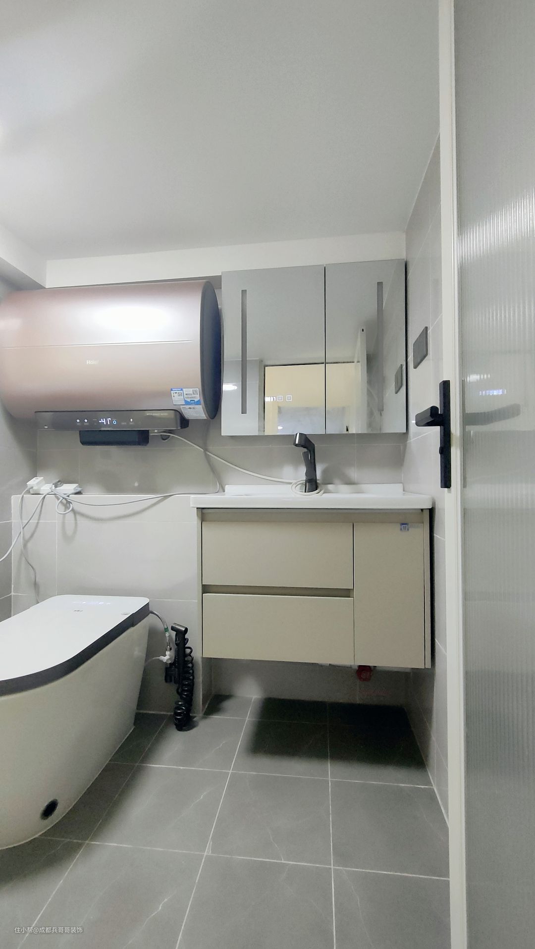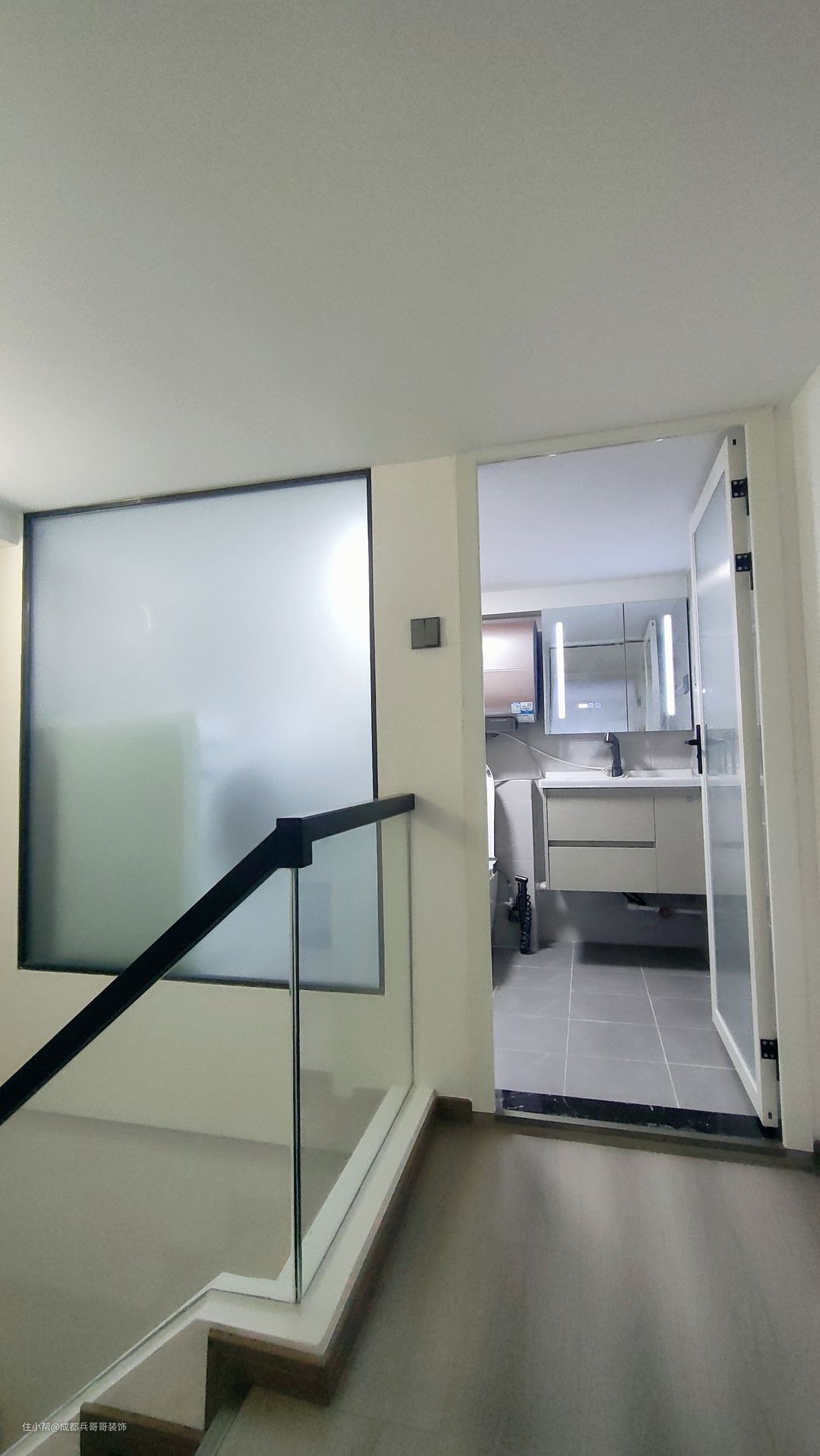 一楼卫生间:干湿分离设计,悬空浴室柜+智能马桶+淋浴间。 二楼卫生间:悬空浴室柜+墙排式马桶+热水器+洗烘一体机,卫生间侧边不砌墙选择全景磨砂玻璃,透光不投影,空间感更好。