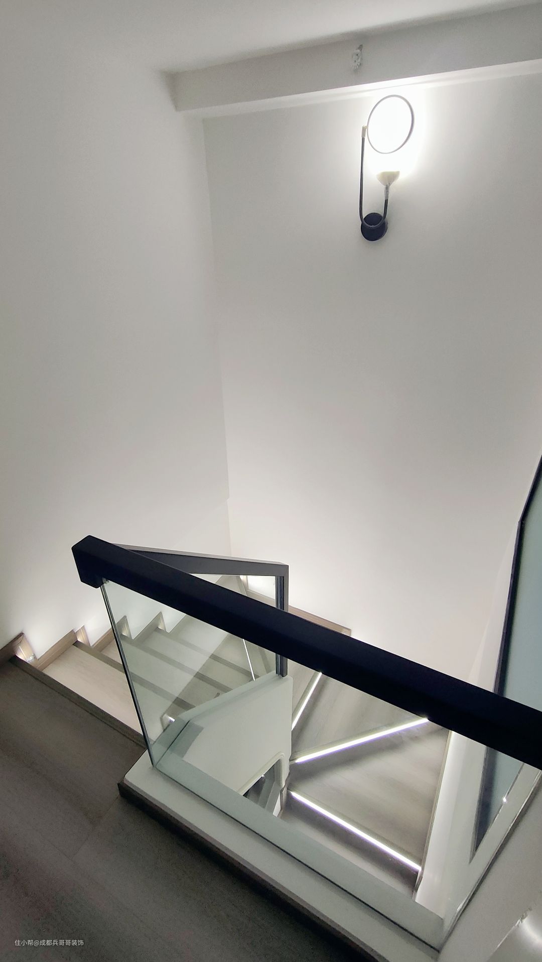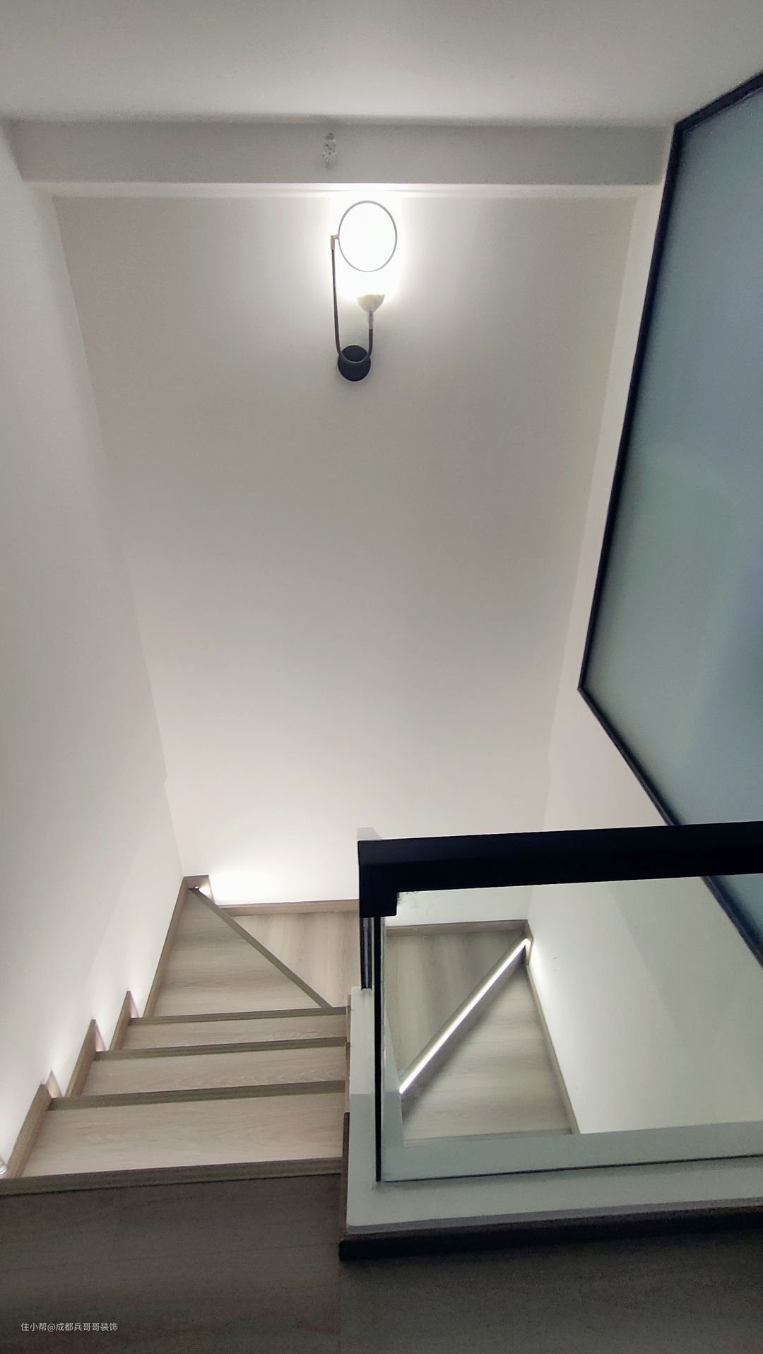这套loft公寓楼梯选择U形楼梯设计,钢结构搭建而成,花纹钢板+槽钢的搭配,再做木基层+铺贴木地板,嵌入感应灯带+壁灯+实木玻璃扶手,楼梯下方做储物间,简约温馨又实用。