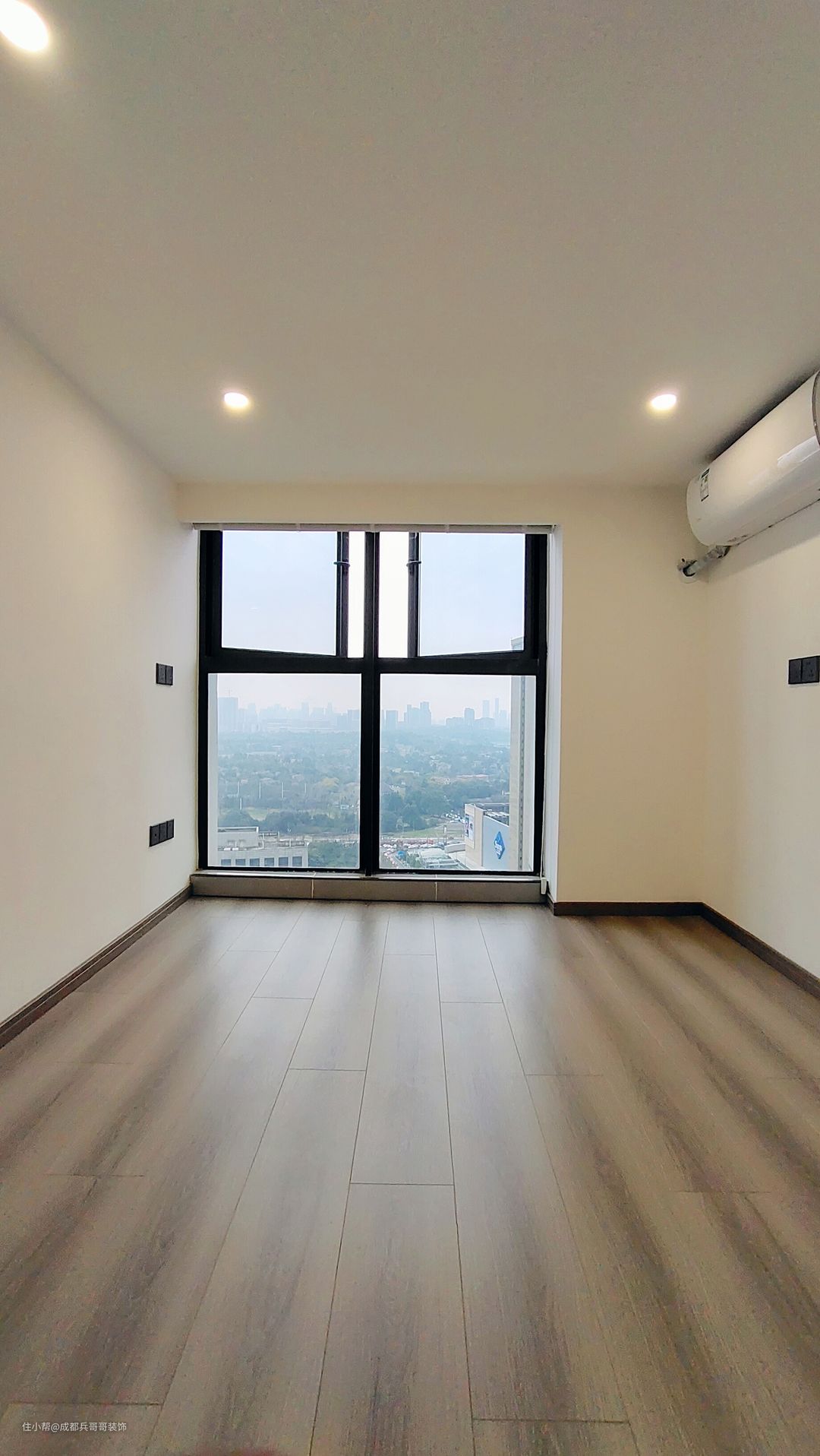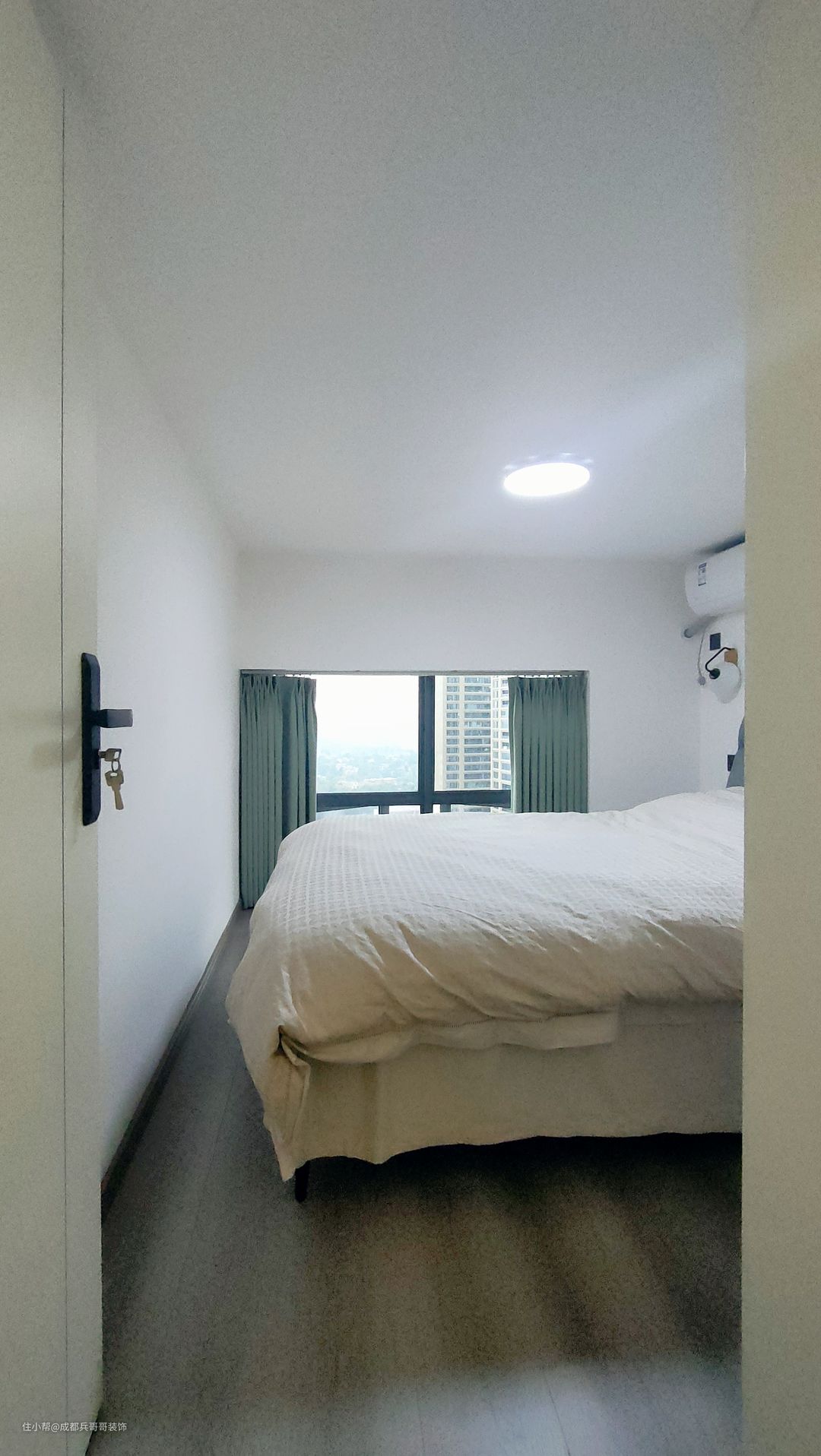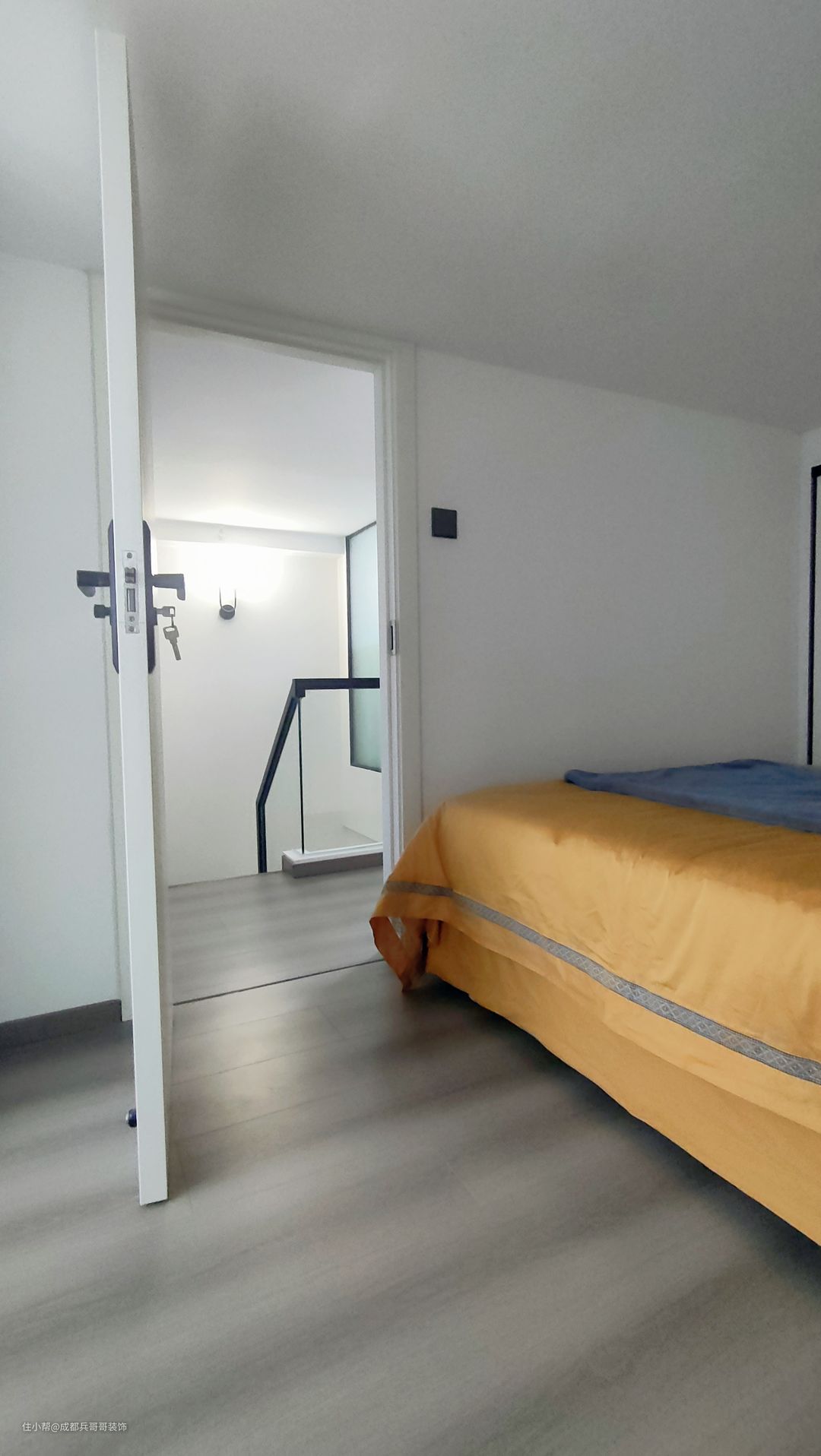 次卧在二楼靠挑空客厅的区域,全屋通铺木地板,衣柜嵌入式推拉门,可以满足四季收纳。卧室侧边全景玻璃窗,可以看到客厅的空间,视觉感很好。