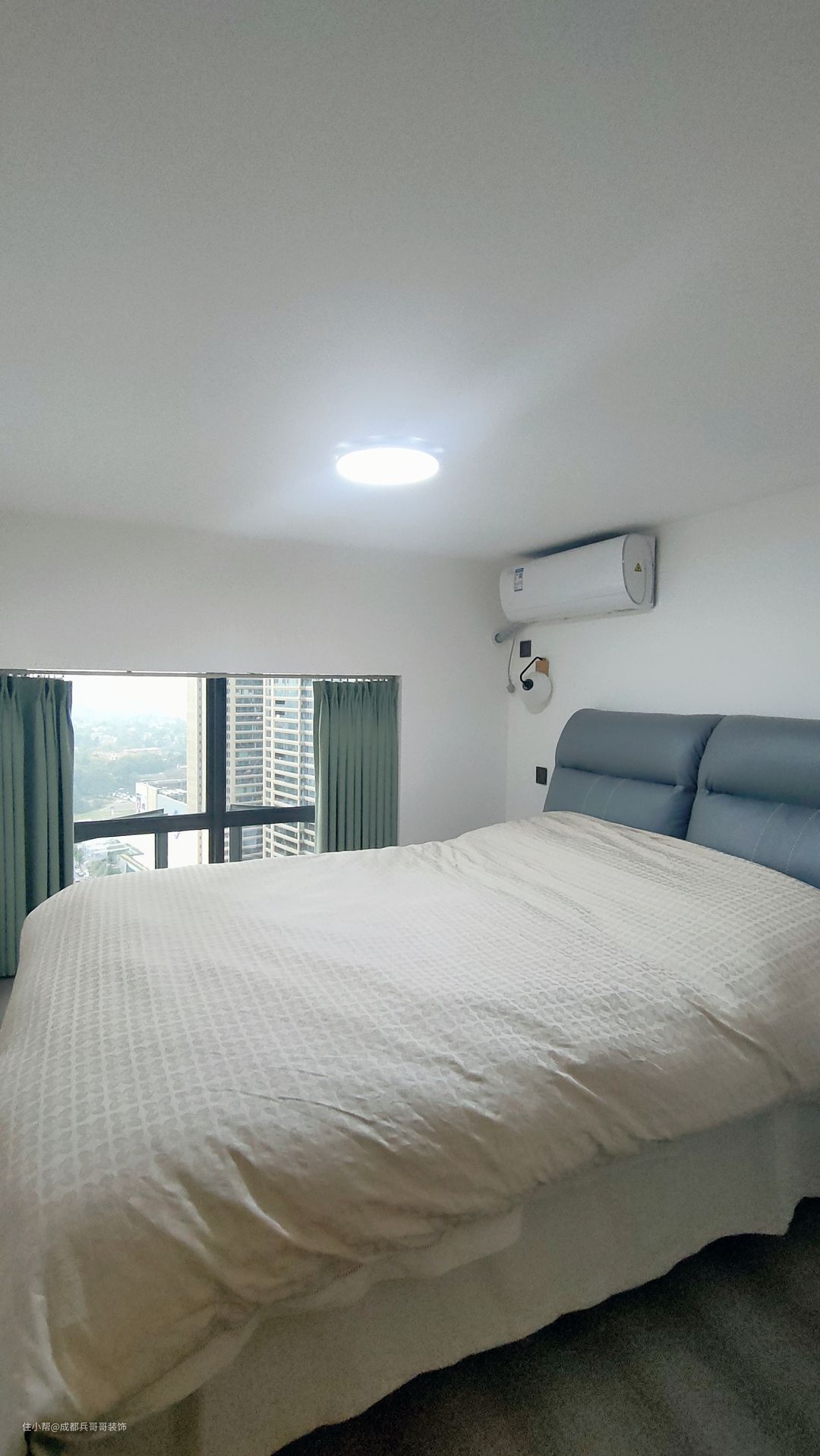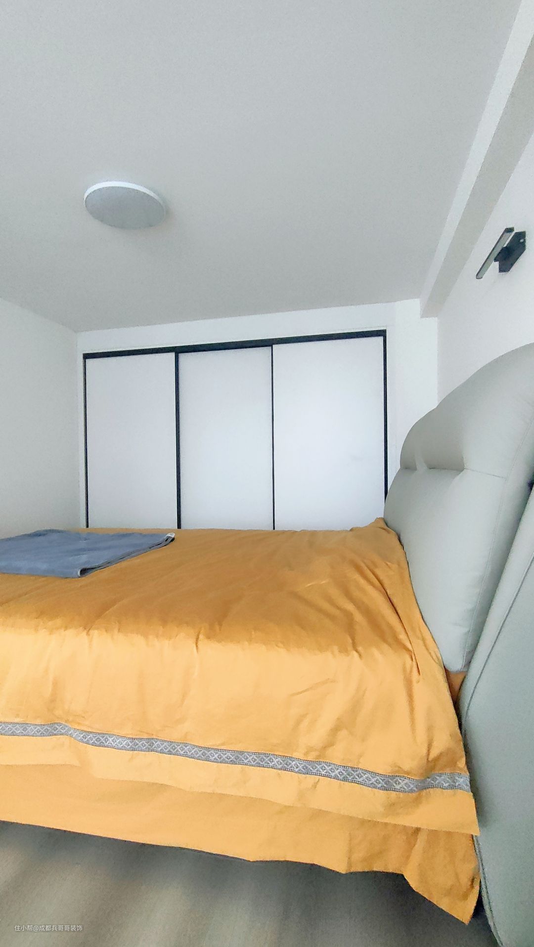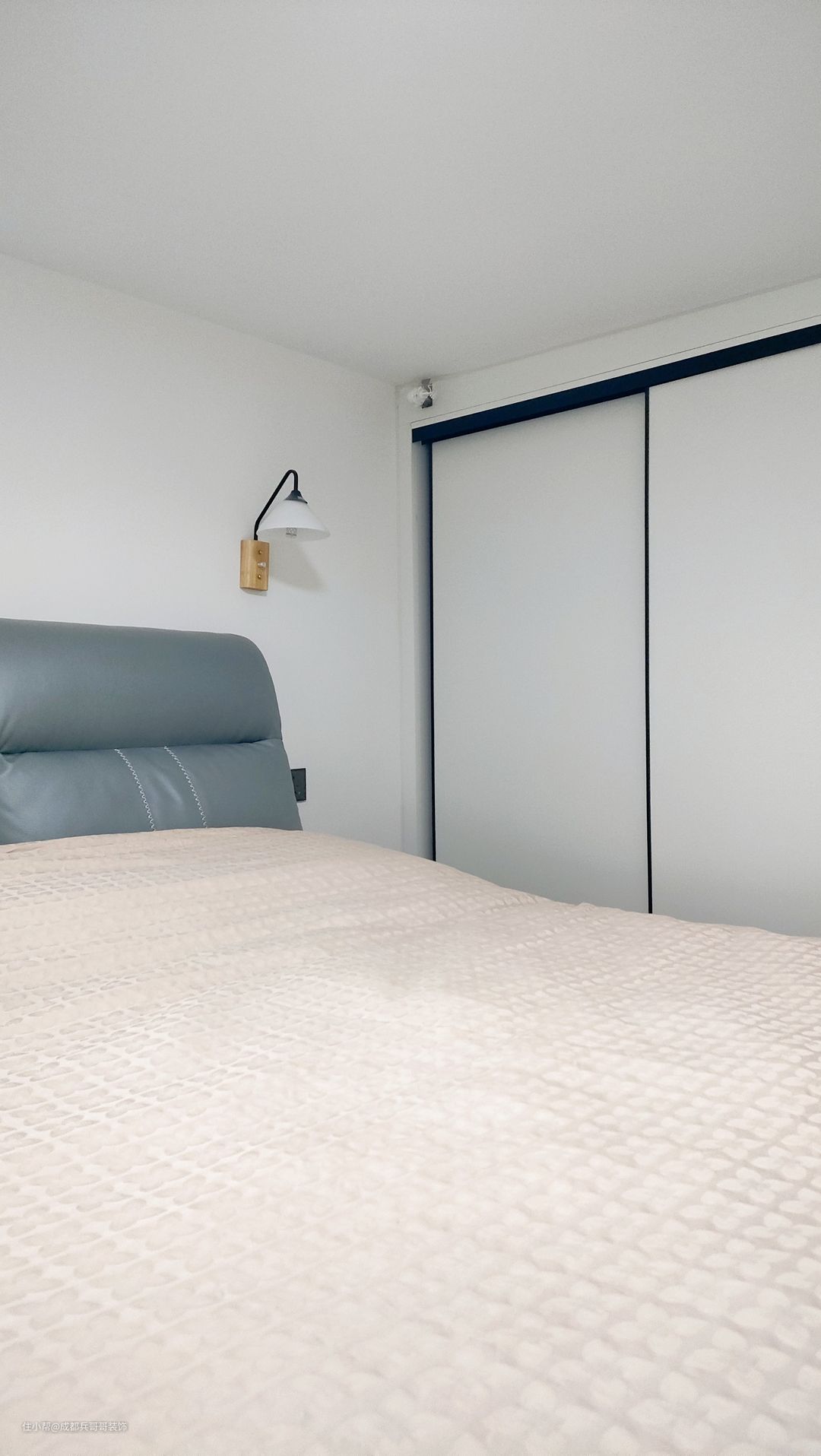主卧设计在二楼,考虑到私密性,侧边砌的满墙,旁边有通风的窗户,室内通透感不用担心。基本功能考虑到位:1.8米大床+推拉门储物衣柜+床头柜,空间上简约干净、整洁美观。
