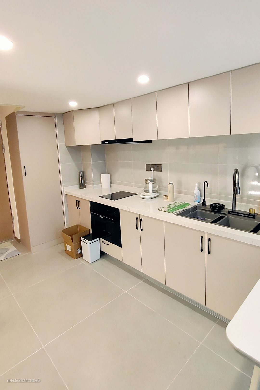 厨房,一字形开放式设计,一整排吊柜+地柜,满足日常储物收纳功能。嵌入了洗碗机和电磁炉,上方吸顶式抽油烟机,水盆是台中盆,安装了抽拉式水龙头,日常清洁十分方便。